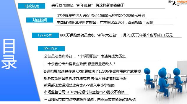 每日新闻速递 2019年1月4日 星期五 目录 时政热点 财经新闻 行业公司 民生百态 央行发7000亿“新年红包” 将这样影响钱袋子 17种抗癌药纳入医保 原价15600元的药如今2396元买到 中国各省份GDP世界排名:广东堪比西班牙,西藏相当于波黑 800万保险营销员喜收“新年大红包”:月入1万元年缴个税可减1.1万元 公务员法首次修订,“非领导职务”表述将成为历史 二十余省份出台稳就业政策 哪些行业还缺人? 春运抢票加速包传递7次抢票成功?12306专家称用软件或更慢 旅游市场黑名单管理办法实施 失信人将被限制出境游 教育部印发通知禁止有害APP进入中小学校园 市场监管总局:2018烟花爆竹抽查检出23批次不合格 三四线城市楼市调控试探性微调,两类城市有望获政策松绑 时政热点 央行发7000亿“新年红包” 将这样影响钱袋子 2019年01月03日 14:36 来源:央视 中国人民银行1月2日晚间发布消息,自2019年起,决定将普惠金融定向降准小型和微型企业贷款考核标准由“单户授信小于500万元”调整为“单户授信小于1000万元”。中国人民银行表示,这有利于扩大普惠金融定向降准优惠政策的覆盖面,引导金融机构更好地满足小微企业的贷款需求,使更多的小微企业受益。天风证券银行业首席分析师廖志明表示,此次央行扩大定向降准范围,呵护流动性意图明显。廖志明预计,此次普惠金融定向降准考核将在1月下旬完成,2月初前将释放流动性,有望明显缓解春节前流动性缺口,体现了央行呵护资金面的用意。廖志明预计,此次央行扩大定向降准范围将释放的流动性在7000亿元左右。 财经新闻 17种抗癌药纳入医保 原价15600元的药如今2396元买到 2019-01-03 00:22:00 来源:央视财经 近几年, 国家医药部门通过谈判纳入医保目录的药品种类越来越多。2015年—2017年,共有18个抗肿瘤药通过谈判进入国家医保目录。覆盖了肺癌、胃癌、乳腺癌、结直肠癌、淋巴瘤、骨髓瘤等多种癌症。谈判药品的平均降价幅度达到 44%,最高达 70%。2018年10月,国家医保局在与国内外药企谈判后,将17种国内患者最急需的新上市天价抗癌药纳入国家医保目录。进入目录后,这些药物平均降幅达56.7%,最高降幅达71.02%。以治疗局部晚期或转移性非小细胞肺癌的“奥希替尼”来说,没有纳入医保前,每瓶售价51000元,医保谈判后,每瓶降到了15300元,价格仅为原来的三分之一。