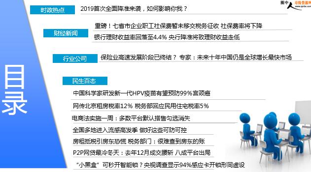 每日新闻速递 2019年1月8日 星期二 目录 时政热点 时政热点 财经新闻 行业公司 民生百态 2019首次全面降准来袭,如何影响你我? 重磅!七省市企业职工社保费暂未移交税务征收 社保费率将下降 银行理财收益率回落至4.4% 央行降准将致理财收益走低 保险业高速发展阶段已终结? 专家:未来十年中国仍是全球增长最快市场 中国科学家研发新一代HPV疫苗有望预防99%宫颈癌 网传北京租房税率12% 税务部回应民用住宅税率5% 电商法实施一周:多数平台默认搭售勾选消失 全国多地进入流感高发季 做好这些可防可控 房租抵税引房东恐慌 税务部门:很难查到房东的账 P2P网贷最冷冬天:去年12月成交腰斩 八成平台出局 “小黑盒”可秒开智能锁?央视调查显示94%感应卡开锁形同虚设 时政热点 2019首次全面降准来袭,如何影响你我? 2019-01-07 12:00 来源:第一财经 进入2019年,也就是被各界誉为经济下行压力最大的一年,支持性政策便不断祭出。在1月2日的定向降准后,央行在1月4日晚间再度宣布全面降准,总体释放流动性1.5万亿元,剔除将置换到期的7000亿MLF(中期借贷便利),净释放流动性8000亿元。而且,这只是拉开序幕,并未结束。然而,释放流动性只是一方面,关键在于,这些流动性如何传导至实体经济?在经济下行、避险情绪加剧、银行资本金受限、影子银行收紧、房贷仍受限的背景下,银行对于小微企业的贷款仍然谨慎,因此流动性能否转化为信贷才是未来观察的重点。 财经新闻 重磅!七省市企业职工社保费暂未移交税务征收 社保费率将下降 2019-01-07 12:10 来源:第一财经 2019年1月1日起,社会保险费划转税务部门工作已经实质性启动,北京、吉林、山西、贵州、湖北、西藏、新疆等七个省份(自治区、直辖市)税务局已发文明确,机关事业单位社会保险费和城乡居民基本养老保险、城乡居民基本医疗保险交由税务部门征收,但并不涉及企业职工社会保险费。部分税务局人士告诉第一财经记者,企业职工社保费确实暂不移交给税务征收。在2019年之前,全国36个省市(自治区、直辖市和计划单列市,下同)中,已有20多个省由税务部门不同程度征收社保费,对于那些企业职工社保费实质上已由税务部门征收的省份来说,将维持现状。某省税务局人士对第一财经记者证实了这一判断。