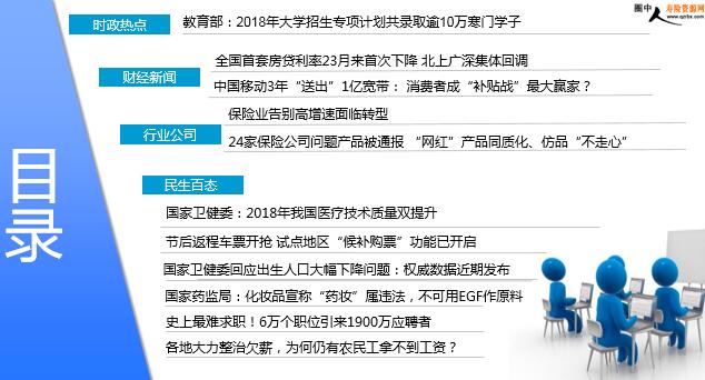 每日新闻速递 2019年1月12日 星期六 目录 时政热点 财经新闻 行业公司 民生百态 教育部:2018年大学招生专项计划共录取逾10万寒门学子 全国首套房贷利率23月来首次下降 北上广深集体回调 中国移动3年“送出”1亿宽带: 消费者成“补贴战”最大赢家? 保险业告别高增速面临转型 24家保险公司问题产品被通报 “网红”产品同质化、仿品“不走心” 国家卫健委:2018年我国医疗技术质量双提升 节后返程车票开抢 试点地区“候补购票”功能已开启 国家卫健委回应出生人口大幅下降问题:权威数据近期发布 国家药监局:化妆品宣称“药妆”属违法,不可用EGF作原料 史上最难求职!6万个职位引来1900万应聘者 各地大力整治欠薪,为何仍有农民工拿不到工资? 教育部:2018年大学招生专项计划共录取逾10万寒门学子 时政热点 2019-01-11 01:41 来源:经济参考报 近日,记者从教育部获悉,2018年针对农村和贫困地区的三个大学招生专项计划共录取学生10.38万人。据介绍,这三个专项计划分别为国家专项、地方专项和高校专项,是推动落实教育扶贫的倾斜政策。国家专项计划定向招收贫困地区学生。招生学校为中央部门高校和各省(区、市)所属重点高校,实施区域为集中连片特殊困难县、国家级扶贫开发重点县以及新疆南疆四地州。国家专项从2012年开始实施,2017年这一规模已增至6.3万名,覆盖贫困县数量也上升到800余个。 财经新闻 全国首套房贷利率23月来首次下降 北上广深集体回调 2019-01-11 00:33 来源:中新经纬 近日,多地传来“房贷利率松动”的消息,尤以一线城市最为突出。先是网传深圳部分商业银行下调房贷利率;后有上海地区实打实新增加5家银行首套最低可执行95折优惠、广州汇丰银行首套房仅上浮5%;北京地区近期虽无房贷利率调整,但目前执行的“基准利率上浮10%”的规定,较2017年同期也明显有所放松。据融360统计,2018年12月共有17个城市首套利率均值出现回调,北上广深以及多数热门二线城市首套利率均值均有不同程度下降。一个月前,即2018年11月,四个一线城市中仅有广州、深圳首套利率回调。而在12月的全国首套利率最低排名中:上海位居第一、北京第四、广州第九、深圳第十,北京的排名较11月上升了2位次。