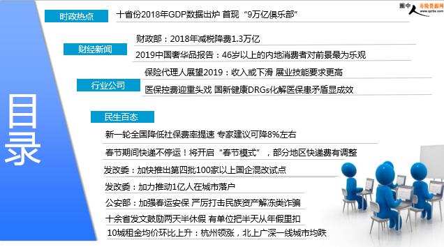 每日新闻速递 2019年1月16日 星期三 目录 时政热点 财经新闻 行业公司 民生百态 十省份2018年GDP数据出炉 首现“9万亿俱乐部” 财政部:2018年减税降费1.3万亿 2019中国奢华品报告:46岁以上的内地消费者对前景最为乐观 保险代理人展望2019:收入或下滑 展业技能要求更高 医保控费迎重头戏 国新健康DRGs化解医保患矛盾显成效 新一轮全国降低社保费率提速 专家建议可降8%左右 春节期间快递不停运!将开启“春节模式”,部分地区快递费有调整 发改委:加快推出第四批100家以上国企混改试点 发改委:加力推动1亿人在城市落户 公安部:加强春运安保 严厉打击民族资产解冻类诈骗 十余省发文鼓励两天半休假 有单位把半天从年假里扣 10城租金均价环比上升:杭州领涨,北上广深一线城市均跌 时政热点 十省份2018年GDP数据出炉 首现“9万亿俱乐部” 2019年01月15日 00:08 来源:中国新闻网 2019年省级地方两会陆续召开。截至14日,已有西藏、北京、天津、河北、湖北、福建、四川、安徽、江苏、新疆10个省区市召开省级地方两会,晒出2018年当地经济成绩单。从经济总量来看,多个省份实现重要跨越,其中,江苏GDP首次迈入“9万亿俱乐部”大门;北京GDP首次突破3万亿,成为第二个GDP超过3万亿元的城市;2018年GDP超过万亿的城市有望增加到17个。从经济增速来看,西藏以两位数增速傲视群雄;而对于2019年GDP增长,多地设定的目标较2018年有所下调。 十省份2018年GDP数据出炉 首现“9万亿俱乐部” 财经新闻 财政部:2018年减税降费1.3万亿 2019-01-15 10:19 来源:北青网 5日,财政部部长助理许宏才应邀参加国新办发布会。会上他总结称,2018年全年减税降费规模约为1.3万亿元。其中,他提到去年我国两次提高部分产品出口退税率,降低关税总水平,我国关税总水平由2017年的9.8%将至7.5%。