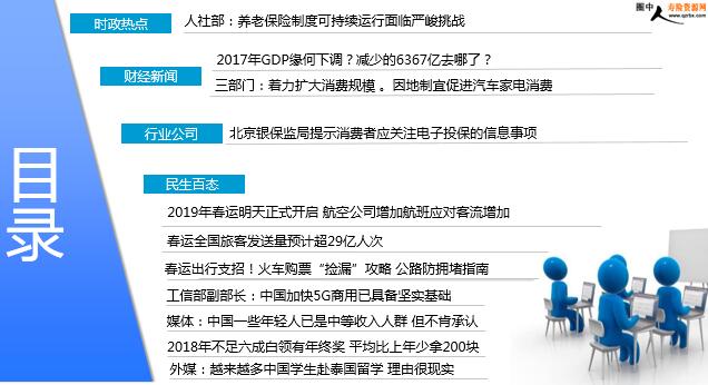 每日新闻速递 2019年1月21日 星期一 目录 时政热点 财经新闻 行业公司 民生百态 人社部:养老保险制度可持续运行面临严峻挑战 2017年GDP缘何下调?减少的6367亿去哪了? 三部门:着力扩大消费规模 。因地制宜促进汽车家电消费 北京银保监局提示消费者应关注电子投保的信息事项 2019年春运明天正式开启 航空公司增加航班应对客流增加 春运全国旅客发送量预计超29亿人次 春运出行支招!火车购票“捡漏”攻略 公路防拥堵指南 工信部副部长:中国加快5G商用已具备坚实基础 媒体:中国一些年轻人已是中等收入人群 但不肯承认 2018年不足六成白领有年终奖 平均比上年少拿200块 外媒:越来越多中国学生赴泰国留学 理由很现实 时政热点 人社部:养老保险制度可持续运行面临严峻挑战 2019年01月16日 13:05 来源:央视网 邱小平说,社会保障是民生安全网,与人民幸福安康息息相关,也关系国家的长治久安。党的十八大以来,以习近平同志为核心的党中央,对社会保障工作作出了一系列重大决策部署。各地区、各部门认真抓好贯彻落实,社会保障工作取得了显著成绩,覆盖城乡居民的社会保障体系已经基本建立,基本养老保险覆盖人数已经达到9.4亿人,失业保险、工伤保险参保人数持续增加,制度公平性明显增强。同时,基金收支规模持续扩大,基金监管机制不断完善,保障水平也在逐步提高,制度运行总体平稳。社会保障卡的持卡人数已经超过12亿人,公共服务能力和水平都进一步增强。但是,我们也要看到,我们国家的社会保障工作还面临许多矛盾和困难,特别是人口老龄化进程加快,老年人口规模大,老龄化高峰持续长等特征明显,养老保险制度可持续运行面临严峻挑战。 财经新闻 2017年GDP缘何下调?减少的6367亿去哪了? 2019-01-20 09:24 来源:经济日报 近日,国家统计局公布了对2017年GDP数据的最终核实,2017年,GDP现价总量为820754亿元,比初步核算数减少了6367亿元;按不变价格计算,比上年增长6.8%,比初步核算数下降0.1个百分点。减少的6367亿元去哪了?分产业看,第一产业的最终核实数为62100亿元,比初步核算数少了3368亿元;第二产业的最终核实数为332743亿元,比初步核算数少了1880亿元;第三产业的最终核实数为425912亿元,比初步核算数少了1119亿元。从核算结果看,并非所有行业的数据都是减少的,有些行业的最终核实数与初步核算数相比则有所增加,比如交通运输、仓储和邮政业、房地产业等。