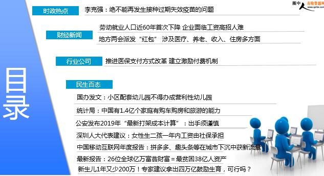 每日新闻速递 2019年1月23日 星期三 目录 时政热点 财经新闻 行业公司 民生百态 李克强:绝不能再发生接种过期失效疫苗的问题 劳动就业人口近60年首次下降 企业面临工资高招人难 地方两会派发“红包” 涉及医疗、养老、收入、住房多方面 推进医保支付方式改革 建立激励付费机制 国办发文:小区配套幼儿园不得办成营利性幼儿园 统计局:中国有1.4亿个家庭有购车购房和旅游的能力 公安发布2019年“最新打架成本计算”:出手须谨慎 深圳人大代表建议:女性生二孩一年内工资由社保承担 中国移动互联网年度报告:拼多多、趣头条等在城市下沉中获新流量 最新报告:26位全球亿万富翁财富=最贫困38亿人资产 新生儿1年又少200万!专家建议拿出四万亿鼓励生育,可行吗? 时政热点 李克强:绝不能再发生接种过期失效疫苗的问题 2019-01-21 20:40 来源:宏观经济 北京儿童医院院长倪鑫在发言中提出要加强儿童慢性病防控,支持社会办医,加强疫苗管理,提高药品价格降价获得感等建议。李克强关切询问目前我国儿童慢性病发病情况,并叮嘱有关部门抓紧研究上述问题。“今年要争取在重点慢性病药品价格上有明显降幅,让患者有切实感受。”李克强说,“在疫苗问题上必须向人民群众作出保证:要严格监管,绝不能再发生接种过期失效疫苗的问题。”中国短道速滑队队长武大靖就发展冰雪运动等提了建议。李克强说,要抓住北京冬奥会筹办契机,推动我国冰雪运动上水平。统筹发展竞技体育和群众健身,不断提升全民健康水平。 财经新闻 劳动就业人口近60年首次下降 企业面临工资高招人难 2019-01-22 07:17 来源: 21世纪经济报道 目前,除了劳动年龄人口快速下降外,实际参与劳动就业的人口也出现拐点。中国经济仍在平稳增长,对劳动力的需求仍在快速增加。“人口红利仍然存在,劳动力资源近9亿人,有一些波动,但这个规模仍然巨大。我国劳动参与率在世界上不算低,我们9亿人当中有7亿多在就业,还是有空间。”1月21日国家统计局局长宁吉喆在解读中国就业人口下降时说。根据国家统计局公布的数据,2018年末全国就业人员77586万人,相比2017年末的77640万人有所下降,但这是1961年以来的首次下降。
