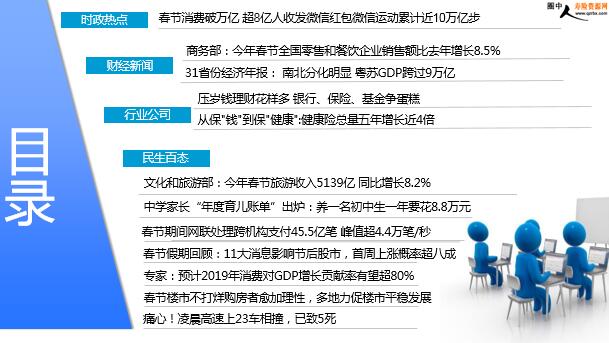 每日新闻速递 2019年2月12日 星期二 目录 时政热点 财经新闻 行业公司 民生百态 春节消费破万亿 超8亿人收发微信红包微信运动累计近10万亿步 商务部:今年春节全国零售和餐饮企业销售额比去年增长8.5% 31省份经济年报: 南北分化明显 粤苏GDP跨过9万亿 压岁钱理财花样多 银行、保险、基金争蛋糕 从保"钱"到保"健康":健康险总量五年增长近4倍 文化和旅游部:今年春节旅游收入5139亿 同比增长8.2% 中学家长“年度育儿账单”出炉:养一名初中生一年要花8.8万元 春节期间网联处理跨机构支付45.5亿笔 峰值超4.4万笔/秒 春节假期回顾:11大消息影响节后股市,首周上涨概率超八成 专家:预计2019年消费对GDP增长贡献率有望超80% 春节楼市不打烊购房者愈加理性,多地力促楼市平稳发展 痛心!凌晨高速上23车相撞,已致5死 时政热点 春节消费破万亿 超8亿人收发微信红包微信运动累计近10万亿步 2019-02-11 02:34 来源:舜网 春节假期已经结束了,经中国旅游研究院综合测算,2019年春节假期,全国旅游接待总人数4.15亿人次,同比增长7.6%;实现旅游收入5139亿元,同比增长8.2%。中国商务部2月10日发布数据显示,今年春节“黄金周”期间全国零售和餐饮企业实现销售额约10050亿元(人民币,下同),突破万亿元大关,比去年春节假期增长8.5%。从数据来看,中国消费升级之势仍在持续,网络消费、定制消费、体验消费、智能消费等新兴消费亮点纷呈。除商品消费更重品质外,休闲旅游、观影观展、民俗活动等体验式消费也越来越受欢迎。假期前六天,三亚八大景区接待游客超过80万人次。故宫博物院节日期间共接待游客近50万人次。 财经新闻 商务部:今年春节全国零售和餐饮企业销售额比去年增长8.5% 2019-02-10 20:28 来源:商务部网站 2019年春节,全国商务系统坚决贯彻落实中央部署,全力做好保障供应工作,让群众吃得放心、穿得称心、用得舒心。黄金周期间,全国商品市场保持平稳较快增长,买年货、吃年夜饭、逛庙会等传统消费红红火火,年节礼品、传统食品、新兴电子产品、地方特色产品销售增长较快,网络消费、定制消费、体验消费、智能消费等新兴消费亮点纷呈。据商务部监测,除夕至正月初六(2月4日至10日),全国零售和餐饮企业实现销售额约10050亿元,比去年春节黄金周增长8.5%。