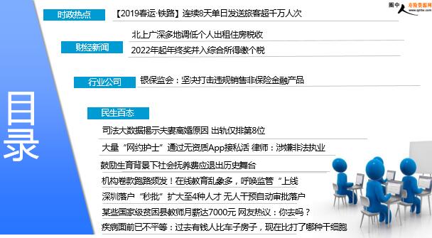 每日新闻速递 2019年2月18日 星期一 目录 时政热点 财经新闻 行业公司 民生百态 【2019春运·铁路】连续8天单日发送旅客超千万人次 北上广深多地调低个人出租住房税收 2022年起年终奖并入综合所得缴个税 银保监会:坚决打击违规销售非保险金融产品 司法大数据揭示夫妻离婚原因 出轨仅排第8位 大量“网约护士”通过无资质App接私活 律师:涉嫌非法执业 鼓励生育背景下社会抚养费应退出历史舞台 机构卷款跑路频发!在线教育乱象多,呼唤监管“上线 深圳落户“秒批”扩大至4种人才 无人干预自动审批落户 某些国家级贫困县教师月薪达7000元 网友热议:你去吗? 疾病面前已不平等:过去有钱人比车子房子,现在比打了哪种干细胞 时政热点 【2019春运·铁路】连续8天单日发送旅客超千万人次 2019年02月17日 09:29 来源:央视网 全国铁路预计发送旅客1100万人次,同比增长8.6%,加开旅客列车872列。铁路春运客流持续高位运行,连续8天单日发送旅客超千万人次。 北京局集团公司加开前往佳木斯、郑州、西安、成都、济南等方向的列车61列;武汉局集团公司加开前往北京、上海、广州等方向的列车110列;济南局集团公司加开前往北京、福州、沈阳等方向动车组列车38列;广州局集团公司加开湖南前往广东、华东等方向的列车242列;成都局集团公司加开前往北京、上海、广州等方向的列车105列;乌鲁木齐局集团公司加开前往上海、成都以及疆内哈密、伊宁、和田等方向的列车5列。沈阳局加开前往北京、齐齐哈尔、大连、长春等方向临时旅客列车61列。 财经新闻 北上广深多地调低个人出租住房税收 2019-02-15 17:39 来源:证券时报 今日,媒体报道,北京个人出租住房税减半,月租金10万以下按2.5%征收。随后,记者又致电上海、广州、深圳等地纳税服务热线了解到,上海和广州也从今年1月开始,下调了个人出租住房的综合税率,而深圳目前对个人出租住房税收政策没有变化。业内人士认为,由于目前多地并没有强制征收,交税比例不高,因此租房税减少对市场影响不大。