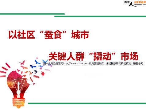 以社区“蚕食”城市 关键人群“撬动”市场 1-市场在哪里? xx的保障范围:28天——60岁 xx可以续保至80岁开门红-主打产品xx(B款)最高投保年龄70岁。。。。。。 哪里有人,哪里就是市场! 2-如何把握市场? 把握住影响力中心,就是把握住市场! 3-影响力在哪里? 4-如何吸引影响力中心? 有东西领!有礼物送!就会有人来! 5-如何把握影响力中心? 2、会画V型图,会说健康险的必要性 拿人手短 吃人嘴短!