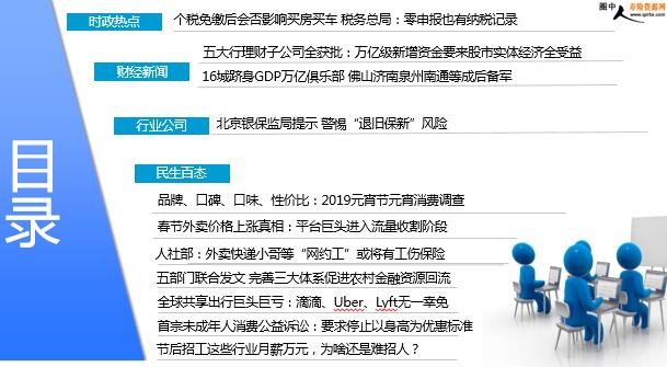 每日新闻速递 2019年2月19日 星期二 目录 时政热点 财经新闻 行业公司 民生百态 个税免缴后会否影响买房买车 税务总局:零申报也有纳税记录 五大行理财子公司全获批:万亿级新增资金要来股市实体经济全受益 16城跻身GDP万亿俱乐部 佛山济南泉州南通等成后备军 北京银保监局提示 警惕“退旧保新”风险 品牌、口碑、口味、性价比:2019元宵节元宵消费调查 春节外卖价格上涨真相:平台巨头进入流量收割阶段 人社部:外卖快递小哥等“网约工”或将有工伤保险 五部门联合发文 完善三大体系促进农村金融资源回流 全球共享出行巨头巨亏:滴滴、Uber、Lyft无一幸免 首宗未成年人消费公益诉讼:要求停止以身高为优惠标准 节后招工这些行业月薪万元,为啥还是难招人? 时政热点 个税免缴后会否影响买房买车 税务总局:零申报也有纳税记录 2019年02月17日 23:29 来源:每日经济新闻 记者发现,2011年发布的《北京市人民政府办公厅关于贯彻落实国务院办公厅文件精神进一步加强本市房地产市场调控工作的通知》中明确,在本市没拥有住房且连续5年(含)以上在本市缴纳社会保险或个人所得税的非本市户籍居民家庭,限购1套住房(含新建商品住房和二手住房)。2017年,北京市发布《进一步严格购房资格审核中个人所得税政策执行标准的公告》,明确连续5年(含)以上在本市缴纳个人所得税,是指按“工资、薪金所得”缴税的纳税人,从申请月的上月开始往前推算60个月在本市连续缴纳个人所得税。根据当时媒体解读,这意味着符合条件的纳税人每月个税纳税额不能为零。报道称,从严执行后,就意味着纳税人必须连续60个月内每月纳税额均不为零。若当月纳税额为零,将不能认定为有纳税记录。 财经新闻 五大行理财子公司全获批:万亿级新增资金要来股市实体经济全受益 2019-02-18 00:50 来源:东方财富网 17日晚间,中国银保监会网站公告,有着宇宙第一大行之称的工商银行设立理财子公司已经正式获批。这是继建设银行、中国银行、农业银行、交通银行之后,五大国有行理财子公司设立全面获批。从去年底首批至今,银保监会分三批核准了五大国有银行的理财子公司设立,在五大国有行之后,还有多家银行的申请已获得受理或拟提交申请,20家以上公告了发起设立理财子公司。值得注意的是,与前两批4家国有行获批的措辞相比,此次工商银行理财子公司获批,新增了“尽快实现理财子公司开业运营,为实体经济和金融市场提供更多新增合规资金”。