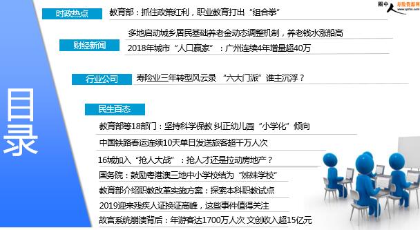 每日新闻速递 2019年2月20日 星期三 目录 时政热点 财经新闻 行业公司 民生百态 教育部:抓住政策红利,职业教育打出“组合拳” 多地启动城乡居民基础养老金动态调整机制,养老钱水涨船高 2018年城市“人口赢家”:广州连续4年增量超40万 寿险业三年转型风云录 “六大门派”谁主沉浮? 教育部等18部门:坚持科学保教 纠正幼儿园“小学化”倾向 中国铁路春运连续10天单日发送旅客超千万人次 16城加入“抢人大战”:抢人才还是拉动房地产? 国务院:鼓励粤港澳三地中小学校结为“姊妹学校” 教育部介绍职教改革实施方案:探索本科职教试点 2019迎来残疾人证换证高峰,这些事件值得关注 故宫系统崩溃背后:年游客达1700万人次 文创收入超15亿元 时政热点 教育部:抓住政策红利,职业教育打出“组合拳” 2019-02-19 14:19 来源:中国网 国务院印发《国家职业教育改革实施方案》,提出了7个方面20项政策举措,把职业教育摆在了前所未有的突出位置。19日上午,教育部召开新闻发布会,具体解读《方案》的主要内容和下一步的工作考虑。《方案》提出,到2022年,一大批普通本科高等学校向应用型转变,建设50所高水平高等职业学校和150个骨干专业(群)。据教育部职业教育与成人教育司司长王继平介绍,目前,国务院职业教育工作联席会议制度已经建立,教育部将会同联席会成员单位出台一系列配套政策,集中形成若干政策红利。各地要抓紧完善本地的职业教育工作机制,发挥好联席会议的作用,推动形成发展职业教育的巨大合力。对改革成效明显的省份进行重点激励。我们将推动建设职业教育改革试验区和其他试点,促进职业教育融入区域经济社会发展。 财经新闻 多地启动城乡居民基础养老金动态调整机制,养老钱水涨船高 2019-02-19 07:01 来源:经济日报 近一段时间以来,部分省份城乡居民基础养老金迎来调整。从不少地方两会开出的2019年民生清单看,提高养老金待遇水平这一惠民举措仍是各地今年民生工作的一项重点。专家指出,城乡居民全国基础养老金最低标准的动态调整机制的建立,有利于提高城乡居民基本养老保险制度运行质量和效益——统一提高人民群众的养老金,让老年人生活更有保障,老有所依,关系到每个家庭,备受社会关注。记者梳理发现,步入2019年,多地发布了城乡居民基础养老金正常调整机制的具体实施意见。新年伊始,部分省份城乡居民基础养老金率先迎来调整。