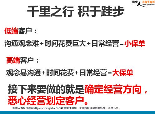 励精卓越 成就典范 千里之行 积于跬步 万里之船 成于罗盘 持续经营 烎在高端 分享大纲 我的保险之路,一生的事业 1、初入行——勤奋、无畏 2、中产之路——提升件均、坚持、专一 3、顶级精英——走进高端、专业 4、品牌经营——文化、口碑、资源整合 持续经营高端客户的最终收获! 千里之行 积于跬步 从业20年,共积累客户2200人 通过陌生拜访积累客户810人 通过转介绍共积累客户1200人 共创造期交保费近1亿元 最大单件保费1000万 所有的一切 都源自于积累和经营 积累客户 积累经营 xxxx养老社区销售件数第一,期缴保费630万 千里之行 积于跬步 没客户、没人脉、没经验, 是真真正正的三无人员 思考:如何在寿险行业拥有属于 自己的客户? 千里之行 积于跬步 自己的客户= 自己开拓+自己经营 客户看不见我 而我的眼里却是无处不在的客户 千里之行 积于跬步 低端客户:沟通观念难+时间花费巨大+日常经营=小保单 高端客户:观念易沟通+时间花费+日常经营=大保单