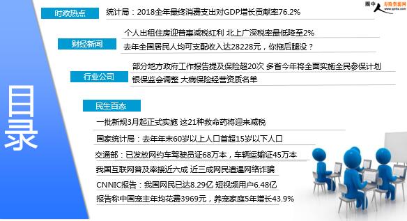 每日新闻速递 2019年3月1日 星期五 目录 时政热点 财经新闻 行业公司 民生百态 统计局:2018全年最终消费支出对GDP增长贡献率76.2% 个人出租住房迎普惠减税红利 北上广深税率最低降至2% 去年全国居民人均可支配收入达28228元,你拖后腿没? 部分地方政府工作报告提及保险超20次 多省今年将全面实施全民参保计划 银保监会调整 大病保险经营资质名单 一批新规3月起正式实施 这21种救命药将迎来减税 国家统计局:去年年末60岁以上人口首超15岁以下人口 交通部:已发放网约车驾驶员证68万本,车辆运输证45万本 我国互联网普及率接近六成 近三成网民遭遇网络诈骗 CNNIC报告:我国网民已达8.29亿 短视频用户6.48亿 报告称中国宠主年均花费3969元,养宠家庭5年增长43.9% 时政热点 统计局:2018全年最终消费支出对GDP增长贡献率76.2% 2019-02-28 10:06 来源:国家统计局 全年全国居民人均可支配收入28228元,比上年增长8.7%,扣除价格因素,实际增长6.5%。全国居民人均可支配收入中位数[57]24336元,增长8.6%。按常住地分,城镇居民人均可支配收入39251元,比上年增长7.8%,扣除价格因素,实际增长5.6%。城镇居民人均可支配收入中位数36413元,增长7.6%。农村居民人均可支配收入14617元,比上年增长8.8%,扣除价格因素,实际增长6.6%。农村居民人均可支配收入中位数13066元,增长9.2%。按全国居民五等份收入分组[58],低收入组人均可支配收入6440元,中间偏下收入组人均可支配收入14361元,中间收入组人均可支配收入23189元,中间偏上收入组人均可支配收入36471元,高收入组人均可支配收入70640元。全国农民工人均月收入3721元,比上年增长6.8%。 财经新闻 个人出租住房迎普惠减税红利 北上广深税率最低降至2% 2019-02-28 06:18 来源: 21世纪经济报道 从2019年1月1日起,受益于小微企业普惠性减税政策,个人出租住宅的综合征收率也迎来普遍下调,该减税政策暂定期限为三年,将执行到2021年12月31日。目前,北京、上海、广州、深圳均已下调个人出租住宅的税率。四座城市原本执行的政策不同,调整后的新政策依然有差异。比如,对于月租金不超过10万元的,北京、深圳的综合征收率均减半,分别降为2.5%、2.25%,上海为3.5%,广州不同的租金对应2%、4%、4.295%。虽然按照税法规定,个人出租住宅的,需要缴纳相应税款,但现实中很多房东并没有缴税。除非租客因为子女教育、住房公积金提取、居住证办理,或者公司能报销租金等,要开具相关证明,需要完税凭证。