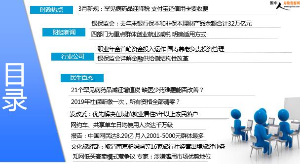 每日新闻速递 2019年3月2日 星期六 目录 时政热点 财经新闻 行业公司 民生百态 3月新规:罕见病药品迎降税 支付宝还信用卡要收费 银保监会:去年末银行保本和非保本理财产品余额合计32万亿元 四部门为重点群体创业就业减税 明确适用方式 职业年金首笔资金投入运作 国寿养老负责投资管理 银保监会详解金融供给侧结构性改革 21个罕见病药品减征增值税 缺医少药难题能否改善? 2019年社保断缴一次,所有资格全部清零? 发改委:优先解决在城镇就业居住5年以上农民落户 网约车、共享单车日均使用人次达千万级 报告:中国网民达8.29亿 月入2001-5000元群体最多 文化旅游部:取消南京驴妈妈等16家旅行社经营出境旅游业务 知网低买高卖模式惹争议 专家:涉嫌滥用市场优势地位 时政热点 3月新规:罕见病药品迎降税 支付宝还信用卡要收费 2019-03-01 08:12 来源:中国新闻网 首批21个罕见病药品减按3%征增值税、《国家级文化生态保护区管理办法》正式施行、3月底前再取消一批税务证明事项、支付宝还信用卡要收费……今天起,一批新规落地施行。 1、21个罕见病药品减按3%征增值税 2、《国家级文化生态保护区管理办法》正式施行 3、公交驾驶区防护侧围最低1.6米 4、《专利代理条例》实施 5、办税开票更便利 6、支付宝还信用卡要收费 财经新闻 银保监会:去年末银行保本和非保本理财产品余额合计32万亿元 2019-02-28 21:26 来源:腾讯财经 据介绍,2018年末,银行保本和非保本理财产品余额合计32万亿元,同比增加2.5万亿元,增长8.5%。其中,非保本理财产品余额22万亿元,与2017年末基本持平;理财资金主要投向债券、存款、货币市场工具等标准化资产,占比约为70%。在理财产品发行结构方面有所优化,同业理财规模和占比持续下降。2018年末,同业理财余额1.2万亿元,同比减少2万亿元,占全部理财产品余额的比例由11%下降至4%,表明“资金空转”现象明显减少。与此同时,面向个人发行的理财产品呈上升趋势,2018年末占比75%。其中,一般个人客户理财产品占比58%,同比上升8个百分点;高资产净值和私人银行理财产品占比17%。