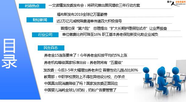每日新闻速递 2019年3月7日 星期四 目录 时政热点 财经新闻 行业公司 民生百态 一文读懂发改委发布会:将研究推出居民增收三年行动方案 福布斯发布2019全球亿万富豪榜 近2万亿元减税降费清单传递四大积极信号 首提社保“第六险” 总理提出“扩大长期护理保险试点”让业界振奋 单位缴费比例可降至16% 职工基本养老保险新变化助企业减负 养老金15连涨要来了!今年养老金拟按平均约5%上涨 养老机构等级国家标准出台:养老院将有“五星级” 发改委:今后3-5年大幅增加养老床位 普惠性幼儿园占比80% 教育部:中职学校原则上不得在异地设分校、办学点 中国真出现消费降级了吗?国家发改委正面回应 中国婴儿消耗全球1/3奶粉,奶粉广告要管管了 时政热点 一文读懂发改委发布会:将研究推出居民增收三年行动方案 2019-03-06 11:16 来源:腾讯财经综合 今后3-5年,将大幅度增加养老床位,普惠性养老床位将增加100万张。实现普惠性幼儿园全覆盖,普惠性幼儿园占比要达80%以上,加快建设一批托幼机构。我们正在会同相关部门和地方简化备案等管理程序,开展重大外资项目服务和推进工作。目前,已推出沈阳华晨宝马、上海特斯拉等两批重大外资项目,当然还会有第三批。为促进消费平稳增长,将增强居民消费能力,多措并举强化居民增收,推动稳增长、保就业、促增收,保障居民收入增长与经济增长同步,将研究推出居民增收三年行动方案。3月6日上午10时,国家发展改革委主任何立峰,副主任宁吉喆、连维良就“大力推动经济高质量发展”相关问题召开记者会,并回答中外记者的提问。 财经新闻 福布斯发布2019全球亿万富豪榜 2019-03-06 08:59 来源:凤凰网 PingWest品玩3月5日讯,美国《福布斯》杂志网站于纽约当地时间3月5日发布第33期年度全球亿万富豪榜。亚马逊CEO杰夫·贝索斯(Jeff Bezos)蝉联榜首,马化腾进入前20名。富豪身家净值总额达到8.7万亿美元,低于2018年的9.1万亿美元。这是2016年以来富豪人数和财富总额首次下降,也是过去10年第2次下降。身家同比下降的富豪人数达到994位,创历史纪录;去年榜单上,只有360位富豪的财富缩水。今年,全球亿万富豪的平均身家为40亿美元,也低于2018年的41亿美元。