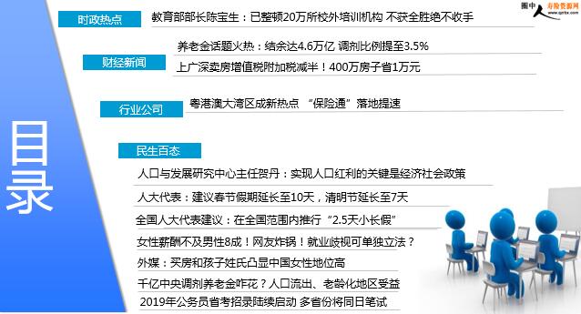 每日新闻速递 2019年3月9日 星期六 目录 时政热点 财经新闻 行业公司 民生百态 教育部部长陈宝生:已整顿20万所校外培训机构 不获全胜绝不收手 养老金话题火热:结余达4.6万亿 调剂比例提至3.5% 上广深卖房增值税附加税减半!400万房子省1万元 粤港澳大湾区成新热点 “保险通”落地提速 人口与发展研究中心主任贺丹:实现人口红利的关键是经济社会政策 人大代表:建议春节假期延长至10天,清明节延长至7天 全国人大代表建议:在全国范围内推行“2.5天小长假” 女性薪酬不及男性8成!网友炸锅!就业歧视可单独立法? 外媒:买房和孩子姓氏凸显中国女性地位高 千亿中央调剂养老金咋花?人口流出、老龄化地区受益 2019年公务员省考招录陆续启动 多省份将同日笔试 时政热点 教育部部长陈宝生:已整顿20万所校外培训机构 不获全胜绝不收手 2019-03-08 08:03 来源:中国青年报 今天,教育部部长陈宝生在全国政协教育界别联组会上表示,2018年,为了保证素质教育的落地实施,通过治标与治本相结合的办法,对全国校外培训机构进行整治。“去年我们调研了全国40.1万所校外培训机构,其中有27.3万所机构存在违规,目前已经整顿了约20万,第一步的任务已经完成了。可以说,战况喜人、战势劳人、战事催人。有些违规培训机构跟我们打‘游击战’,我跟你就打‘持久战’;有的跟我打‘麻雀战’,打一枪,换个地方,我就跟你打‘攻坚战’。这一次,不获全胜绝不收手。”陈宝生说。 财经新闻 养老金话题火热:结余达4.6万亿 调剂比例提至3.5% 2019-03-08 07:16 来源: 21世纪经济报道 先是政府工作报告提出,下调城镇职工基本养老保险单位缴费比例,继续提高退休人员基本养老金。预算草案报告则提出,今年退休金上涨5%,推动建立国有资本划转和企业职工基本养老保险基金缺口逐步弥补相结合的运行机制。到了3月7日,财政部部长刘昆在十三届全国人大二次会议记者会上表示,为缓解各地养老保险基金负担不均的问题,去年执行中央调剂制度,仅半年调剂额达到2400多亿元。今年提高调剂比例到3.5%,调剂规模将达到6000亿元左右。此外,拟安排中央财政基本养老金转移支付预算7392亿元,同比增长10.9%。“根据调剂公式来看,人口流入、老龄化程度较轻的经济发达地区,社平工资高、缴费人数多,上解资金多;而人口流出、老龄化程度高的地方,退休人员多,能拿到的下拨资金多。”