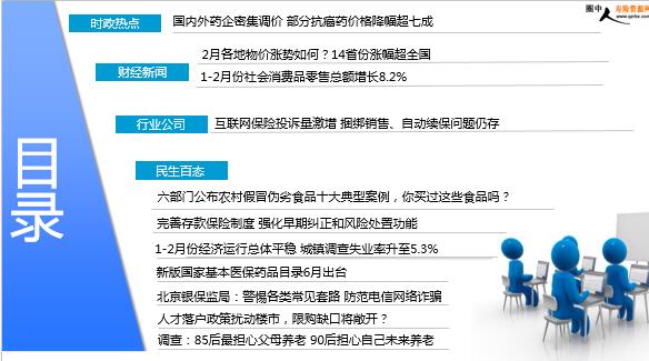 每日新闻速递 2019年3月15日 星期五 目录 时政热点 财经新闻 行业公司 民生百态 国内外药企密集调价 部分抗癌药价格降幅超七成 2月各地物价涨势如何?14省份涨幅超全国 1-2月份社会消费品零售总额增长8.2% 互联网保险投诉量激增 捆绑销售、自动续保问题仍存 六部门公布农村假冒伪劣食品十大典型案例,你买过这些食品吗? 完善存款保险制度 强化早期纠正和风险处置功能 1-2月份经济运行总体平稳 城镇调查失业率升至5.3% 新版国家基本医保药品目录6月出台 北京银保监局:警惕各类常见套路 防范电信网络诈骗 人才落户政策扰动楼市,限购缺口将敞开? 调查:85后最担心父母养老 90后担心自己未来养老 时政热点 国内外药企密集调价 部分抗癌药价格降幅超七成 2019-03-14 11:32 12:45 来源:中国新闻网 本月,“4+7”带量采购试点进入落地阶段。伴随国家和地方层面密集推出举措促药品降价,国内外医药企业也开始为争取市场份额,加入调价行列,部分药企产品降价幅度甚至超过七成。国家医保局对外公布了《国家医疗保障局关于国家组织药品集中采购和使用试点医保配套措施的意见》,对“4+7”带量采购试点未中选药品的医保支付标准进行调整。依照《意见》, 非中选药品2018年底价格为中选价格2倍以上的,2019年按原价格下调不低于30%为支付标准,并在2020年或2021年调整到以中选药品价格为支付标准。非中选药品2018年底价格在中选价格和中选价格2倍以内(含2倍)的,原则上以中选价格为支付标准。 财经新闻 2月各地物价涨势如何?14省份涨幅超全国 2019-03-14 06:02 来源:中新经纬 2月份全国各地物价水平如何?国家统计局近日公布了2月份全国31个省(区、市)居民消费价格指数(CPI)。中新经纬客户端梳理发现,有14个省份2月CPI同比涨幅超过全国平均水平。2月份全国CPI同比上涨1.5%,涨幅比上月回落0.2个百分点。至此,CPI同比涨幅已连续3个月处于“1时代”。在地方层面,西藏、陕西、宁夏、天津、江苏、河北、上海、广东、广西、北京、山西、浙江、江西、甘肃这14个省份2月份CPI同比涨幅超过全国平均水平。吉林、山东、湖北、湖南、云南、青海6地2月份CPI同比涨幅与全国持平。