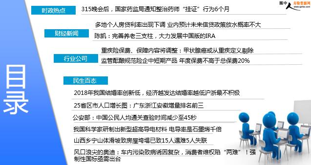 每日新闻速递 2019年3月20日 星期三 目录 时政热点 财经新闻 行业公司 民生百态 315晚会后,国家药监局通知整治药师“挂证”行为6个月 多地个人房贷利率出现下调 业内预计未来信贷政策放水概率不大 陈凯:完善养老三支柱,大力发展中国版的IRA 重疾险保费、保障内容将调整:甲状腺癌或从重疾定义剔除 监管酝酿规范险企中短期产品 年度保费不高于总保费20% 2018年我国结婚率创新低,经济越发达结婚率越低沪浙最不积极 25省区市人口增长图:广东浙江安徽增量排名前三 公安部:中国公民人均通关查验时间减少至45秒 我国科学家研制出新型超高导电材料 电导率是石墨烯千倍 山西乡宁山体滑坡致房屋垮塌已致15人遇难5人失联 时政热点 315晚会后,国家药监局通知整治药师“挂证”行为6个月 2019-03-19 14:19 来源: 澎湃新闻网 从国家药监局官网获悉,针对3月15日晚,中央广播电视总台曝光了重庆市部分药品零售企业执业药师“挂证”、不凭处方销售处方药等问题,国家药监局综合司17日发布“关于开展药品零售企业执业药师‘挂证’行为整治工作的通知”。通知指出,为全面落实药品监管“四个最严”要求,严厉打击执业药师“挂证”行为,现决定在全国范围内开展为期6个月的药品零售企业执业药师“挂证”行为整治。 财经新闻 多地个人房贷利率出现下调 业内预计未来信贷政策放水概率不大 2019-03-19 07:38 来源:中国证券报 记者日前就首套房、二套房个人房贷政策走访了北京、深圳等地四大国有银行及多家股份制银行、城商行的个人贷款业务部门。目前北京地区首套房个人房贷利率普遍执行基准利率上浮10%,二套房利率普遍执行基准利率上浮20%,此前最高分别上浮20%和30%。记者从21世纪不动产业务员处了解到,北京地区个别城商行的二套房贷款利率最低可执行基准利率上浮15%;个别外资银行首套房贷款利率最低可执行基准利率上浮5%,二套房利率最低为基准利率上浮10%。但外资银行对贷款申请人及房屋本身的审核门槛都较高。上海地区首套房个人房贷款利率为一线城市最低,四家国有大行和招行等股份制银行的首套房个人房贷利率最低可执行基准利率九五折优惠。民生银行首套房个人房贷利率执行基准利率。