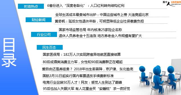 每日新闻速递 2019年3月22日 星期五 目录 时政热点 财经新闻 行业公司 民生百态 6省份进入“深度老龄化”:人口红利转向结构红利 全球生活成本最贵城市出炉:中国这些城市上榜 大连竟超北京 黄奇帆:延后女性退休年龄,可明显降低企业社保缴费负担 国家市场监管总局 年内核准25家险企名称 退休人员养老金十五连涨 地方养老金入市规模有望扩大 国家医保局:182万人次实现跨省异地就医直接结算 80后成酒类消费主力军,女性和90后消费群正在崛起 爱自由还是养娃贵? 2018年出生率普降,京沪津、东北垫底 国航3月31日起实行国内客票退改手续费新标准 电竞行业召唤50万人才!网友:感觉人生到达了巅峰 95后也加入失眠大军 有人花重金买“安睡枕”求一夜好觉 时政热点 6省份进入“深度老龄化”:人口红利转向结构红利 2019-03-21 10:57 来源:第一财经 按照国际通行划分标准,当一个国家或地区65岁及以上人口占比超过7%时,意味着进入老龄化;达到14%,为深度老龄化;超过20%,则进入超老龄化社会。《四川省2018年人口统计公报》显示,2018年,四川65岁及以上常住人口1181.9万人,占人口总量14.17%,比全国高2.23个百分点,比2017年提高0.23个百分点,比2010年提高3.22个百分点,平均每年提高0.4个百分点。四川是人口大省,人口数量曾长期位居全国第一,而且四川经济尚处于发展中阶段,为何快速老龄化,未富先老? 财经新闻 全球生活成本最贵城市出炉:中国这些城市上榜 大连竟超北京 2019-03-20 21:38 来源:券商中国 今年排名前十的城市依次为:1.新加坡、巴黎、香港(并列);4.苏黎世;5.日内瓦、大阪(并列);7.首尔、哥本哈根、纽约(并列);10.洛杉矶、特拉维夫(并列)。今年排名前十的城市中有两个美国城市,纽约和洛杉矶分列第8和第10位,而去年的榜单中美国城市全部在前十以外。中国方面,除了香港位列第一外,排名最高的是上海和深圳,均排全球第25位。此外,与美国不同,中国城市排名在下降,其中,上海排名下降4位(2018年排名第21名),深圳排名下降2名(2018年排名23名)。