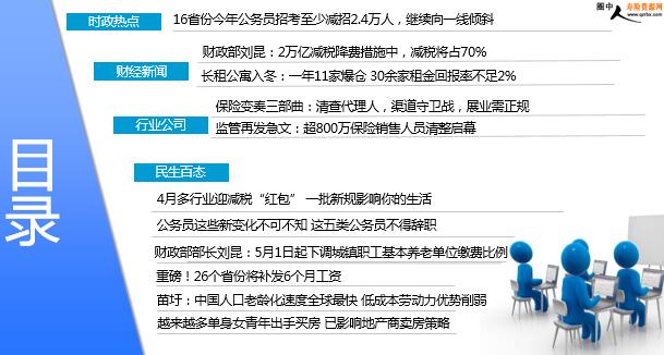 每日新闻速递 2019年3月26日 星期二 目录 时政热点 财经新闻 行业公司 民生百态 16省份今年公务员招考至少减招2.4万人,继续向一线倾斜 财政部刘昆:2万亿减税降费措施中,减税将占70% 长租公寓入冬:一年11家爆仓 30余家租金回报率不足2% 保险变奏三部曲:清查代理人,渠道守卫战,展业需正规 监管再发急文:超800万保险销售人员清整启幕 4月多行业迎减税“红包” 一批新规影响你的生活 公务员这些新变化不可不知 这五类公务员不得辞职 财政部部长刘昆:5月1日起下调城镇职工基本养老单位缴费比例 重磅!26个省份将补发6个月工资 苗圩:中国人口老龄化速度全球最快 低成本劳动力优势削弱 越来越多单身女青年出手买房 已影响地产商卖房策略 时政热点 16省份今年公务员招考至少减招2.4万人,继续向一线倾斜 2019-03-25 10:59 来源:澎湃新闻网 近期,全国公布2019年公务员省考招录计划的省份不断增加,澎湃新闻梳理发现,与上一次招录相比,至少有16个省份(内蒙古、天津、安徽、广西、宁夏、海南、陕西、广东、云南、山西、湖南、湖北、江西、福建、山东、贵州)此次给出的名额出现不同幅度减少,合计超过2.4万人。与此同时,2018年停招一年的人口大省河南,2019年的名额较2017年增加了18%。据各地媒体分析,机构改革后,许多单位因为业务调整导致内设机构和公务员编制发生变化,也有单位公务员编制减少,另外,随着国税地税合并,税务系统的公务员招录由原来的国考省考一起招,变为现在的只在国考招录,还有的减招因涉及参公事业单位暂停招考。 财经新闻 财政部刘昆:2万亿减税降费措施中,减税将占70% 2019-03-24 14:53 来源:腾讯新闻一线 以“坚持扩大开放 坚持合作共赢”为主题的2019中国发展高层论坛期间,在被问及中国2万亿元的减税降费主要体现在哪些方面时,财政部部长刘昆回应,以减税为主体,大约占据70%。其他则包括社保降费、各种政府性收费与企业的经营性收费等。“通过普惠性减税和结构性减税并举,重点降低制造业和小微企业的税收负担,增强企业的获得感。” 刘昆表示,重点之一是小微企业,将减少这些企业的所得税。具体而言,将根据应纳税所得额的不同,采取不同的所得税优惠税率。同时,他表示,财政部提高了增值税小规模纳税人的免税标准,采取比较简明的方式。相应地,地方政府也将出台一系类配套措施。在50%税额的幅度内减征资源税、城乡维护建设税、房产税、印花税、城镇土地使用税和耕地占用税。