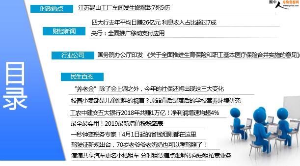 每日新闻速递 2019年4月1日 星期一 目录 时政热点 财经新闻 行业公司 民生百态 江苏昆山工厂车间发生燃爆致7死5伤 四大行去年平均日赚26亿元 利息收入占比超过7成 央行:全面推广移动支付应用 国务院办公厅印发 《关于全面推进生育保险和职工基本医疗保险合并实施的意见》 “养老金”除了会上调之外,今年的社保还将出现这三大变化 校园小卖部是儿童肥胖的祸首?原罪背后是落后的学校营养环境研究 工农中建交五大银行2018年共赚1万亿!净利润增速均超4% 最全最实用!2019最新增值税税率表 一秒钟变税务专家!4月1日起的省钱细则都在这里 驾驶证新规出台,70岁老爷爷老奶奶也可以考驾照了! 滴滴共享汽车更名小桔租车 分时租赁痛点难解转向短租拓宽业务 时政热点 江苏昆山工厂车间发生燃爆致7死5伤 2019-03-31 11:51 来源:新京报 3月31日上午7:12左右,昆山综保区汉鼎精密金属有限公司加工中心车间室外场地上存放废金属的一个集装箱发生一起燃爆,引起车间起火,导致7人死亡, 1人重伤,4人轻伤。截止上午10时许,事故现场清理完毕。事故原因正在调查中。事故发生后,苏州市委市政府、昆山市委市政府主要领导和分管领导,第一时间赶赴现场指导救援和事故处置工作。 财经新闻 四大行去年平均日赚26亿元 利息收入占比超过7成 2019-03-31 08:44 来源:北京青年报 目前,中国工商银行、中国建设银行、中国农业银行和中国银行这四大国有银行的年报已经全数出炉。年报显示,去年这四大国有银行利润全都稳健增长,实现净利润共计9494.15亿元。如果按照一年365天计算,四大行去年平均日赚26.01亿。年报显示,“宇宙第一大行”工商银行2018年实现净利润2987亿元,同比增长3.9%,平均日赚8.18亿元,稳坐全球最赚钱银行宝座。建行去年实现净利润2556亿元,以4.93%的净利增幅,成为四大行中利润增长最高的银行。农行2018年实现净利润2026亿元,首次超越2000亿元的关口,同比增长4.9%;中行去年实现净利润1924亿元,同比增长4.03%。