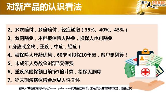 我为什么要卖健康险 PART 1 我为什么要卖健康险 PART 2 对新产品的认识看法 PART 3 对健康险的认识 目录 CONTENTS 我为什么要卖健康险 我认为健康险就是大桥上的防护栏,不管用得上用不上,都必须要有。健康的保障,就像一颗定心丸,有了保障,才可以心安理得的从事自己的工作,专注自己的生活,认真做好自己该做的事而无后顾之忧。 高血压人口有1.6----1.7亿人高血脂的有将1亿多人肥胖症或超重者7000万-----2亿人血脂异常的1.6亿人脂肪肝患者约1.2亿人平均每30秒就有一个人罹患癌症平均每30秒就有一个人罹患糖尿病平均每30秒至少有一个人死于心脑血管疾病 中国人健康大数据概况 一个客户给她两个孩子,分别投保了50万的健康保障,说了这样一句让很多人感动的话:如果孩子一生中真的罹患疾病,治不治得好那是老天爷和医生的事情;但有没有钱治,那是我的事情,如果因为前者我会很伤心但能放下;如果因为后者没钱治疗而不得不放弃,那会是我永远的痛,我会永远无法原谅我自己!人们总说生病是有概率的,但身为父母,我不敢赌! 保险能等你,但风险不会等你。“没有切肤之痛,不知道买保险的好处,总觉得买保险没有用。”作为家庭的依靠,别再让悲剧来教会我们这个道理了! 我为什么要卖健康险 从来没有人因为买健康保险而倾家荡产,只有人因没买保险而负债累累。之所以说“没钱”就是因为没买保险,尤其是健康人生;不是没有钱,而是因为家人没有适度保障没有安全感,有钱只敢储备不敢用,其实是随时准备“一病回到解放前”。