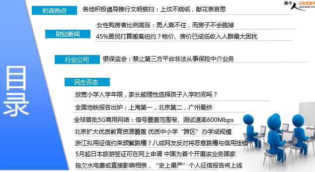 每日新闻速递 2019年4月8日 星期一 目录 时政热点 财经新闻 行业公司 民生百态 各地积极倡导推行文明祭扫:上坟不烧纸,献花表哀思 女性购房者比例高涨:男人靠不住,而房子不会跑掉 45%居民打算搬离纽约?物价、房价已成低收入人群最大困扰 银保监会:禁止第三方平台非法从事保险中介业务 放宽小学入学年限,家长能理性选择孩子入学时间吗? 全国地铁报告出炉:上海第一,北京第二,广州最挤 全球首批5G商用网络:信号覆盖范围窄、测试速率600Mbps 北京扩大优质教育资源覆盖 优质中小学“跨区”办学成规模 浙江拟用征信约束频繁跳槽?八成网友反对将恶意跳槽与信用挂钩 5月起日本旅游签证可在网上申请 中国为首个开展该业务国家 拖欠水电费或直接影响相亲,“史上最严”个人征信报告将上线 时政热点 各地积极倡导推行文明祭扫:上坟不烧纸,献花表哀思 2019-04-07 04:29:00 来源:人民日报 “上坟不烧纸,献花表哀思。近几年,绿色祭扫方式已得到越来越多村民的认可支持。”4月5日一早,湖南省汝城县文明瑶族乡沙洲村村民朱社乐和家人步行上山祭扫,不带鞭炮香烛,而是手捧几束鲜花。清明节期间,全国各地积极开展各项活动,宣传文明祭扫新风,倡导人们改变观念,推动移风易俗。4月5日上午,济南市林场联合泉城义工和驻济高校志愿者,开展了“送您一枝鲜花 请把火种留下”森林防火文明祭扫宣传活动。一大早,迎着晨风,来自济南市林场和泉城义工、驻济高校的近百名青年志愿者手持鲜花、身披“森林防火志愿者”绶带,通过免费赠送鲜花、防火宣传卡和祭扫工具等方式,向前来祭扫的市民宣传文明祭扫理念和森林防火工作的重要性,共同倡导树立文明祭扫新风尚。 财经新闻 女性购房者比例高涨:男人靠不住,而房子不会跑掉 2019-04-07 07:39 来源:经济参考报 女子有房万事足。这么说不是我腐朽,是《2019年女性安居报告》的结论。该调查显示,2018年女性购房者的比例为46.7%,达到了近7年来的最高值,与男性购房者的占比已很接近。其中30岁以上大龄女青年购房者逐年增加,比例高于平均值。大龄女青年偏爱两居室、靠近地铁的精装小户型。我记得早些年成都某白领女性盘就叫“她世纪”,当地保安还不得争着要去上岗啊。可惜,这是A女不配D男,两差了。城市剩女的本质是把一些男性“剩下”了,她们不急于结婚,无求于男性。如今有套房更是这样了。 独立有房子是幸福生活保障,会给职场、情场焦虑的女性带来莫大抚慰。我就听某位单身女主编说过,房子比男人可靠。所以她前前后后在广州攒了三套房。
