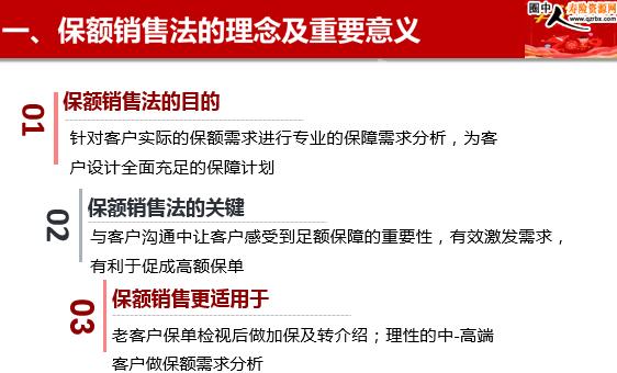 销售技能强化训练 重疾风险管理 人的本性— 关注获得远大于付出 让我们一起用保额思维来逆向思考: 一个小康的三口之家: 年薪:40万 年薪:15万 存款:30万 假如:男主不幸罹患重大疾病;治疗费用30万;5年内在家养病每年康复费用:12万元; 5年的治疗和康复=30万治疗费*50%+12X5万治疗、康复+5X40万年薪损失 近300万 请问:50万重疾保额够吗? 实际:商业健康险保额目前远不能满足客户实际需求 健康险保额偏低,无法满足现实需求 按照保费来确定保额,导致客户关注点聚焦在付出的保费,而不是获得的保障! 思考:让健康险保费做大遇到瓶颈的关键原因: 身为专业保险人 我们应当给予客户最全面的生命呵护方案 客户视角:生容易,活容易,生活不容易 “保额销售”提供的是一种不同于以往的销售思路它的核心内容: 根据客户的家庭情景,挖掘客户的实际需求,根据客户的需求为他设计合适的保额,选择合适的产品,最后得出每年应该交多少保费。 某客户想获得重大疾病医疗费保障,他首先考虑的问题将是 多少保障够? 而不是每年交***够不够? 人们的思维习惯 因此在销售过程中,我们应该突出保额的重要性,强调保额对客户的保障意义,而不是纠结于每年交多少保费,这便是“保额销售法”。