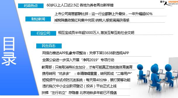 每日新闻速递 2019年4月16日 星期二 目录 时政热点 财经新闻 行业公司 民生百态 60岁以上人口近2.5亿 各地为养老再出新举措 上市公司高管薪酬比拼:这一行业薪酬上升最快,一年升幅超60% 减税降费政策红利集中兑现 纳税人感受满满获得感 相互宝成员半年超5000万人 激发互帮互助社会文明 网信办推进APP乱象专项整治:关停下架33638款违规APP 全国公安进一步深入开展“净网2019”专项行动 教育部:只有取消特长生加分,才有可能真正地实施体育美育 携号转网“坑多多” :申请障碍重重,转网即成“二等用户” 短视频平台试点防沉迷系统:每天限40分钟,禁打赏等功能 违约拖欠中小企业款项登记(投诉)平台正式上线 扶梯“左行右立”存隐患 北京地铁多年前已不提倡 时政热点 60岁以上人口近2.5亿 各地为养老再出新举措 2019年04月15日 13:14 来源:新华社 [沪郊奉贤区]探索以社区养老为突破口,形成农村的社会养老服务体系。[广东东莞]将居家养老服务供给对象,由“东莞户籍年满60周岁老年人”拓宽至 “在本市行政区域内居住的60周岁及以上的老年人”。[江苏常州]全面打通医疗卫生和养老服务资源的体制机制壁垒,吸引各地社会资本参与养老机构建设、运营和管理。[青海西宁]建立社会力量准入机制以公办民营、民办公助等方式,鼓励社会力量建设运营养老服务设施。[浙江兰溪]打造新型“居家住区医护型机构式养老”百城康养项目,,融居家养老、机构养老社区养老、医护型综合性养老四种模式为一体。[福建]《养老服务补短板2019年行动方案》印发,提出全年实现新增各类养老床位1万张,,每千名老年人拥有床位数提高到34张以上。[广州]《广州市民政局关于全面推行养老机构责任保险的通知》印发,将市、区各级公办养老机构(含农村敬老院)纳入责任保险购买范围。[上海]今年上海将继续发展“嵌入式”养老,在城区打造“15分钟居家养老服务圈”。[重庆]今年计划再建设社区养老服务站400个。[长沙]《长沙市人民政府办公厅关于全面放开养老服务市场提升养老服务质量的实施意见》印发,明确了降低养老机构准入门槛等多项举措。 财经新闻 上市公司高管薪酬比拼:这一行业薪酬上升最快,一年升幅超60% 2019-04-15 08:01 来源:北青网 从行业来看,数据宝统计显示,高管人均薪酬方面,非银金融连续三年蝉联第一位,2018年度高管人均薪酬均值接近300亿,银行连续三年蝉联第二;钢铁行业以230.71万元跃居第三位,较2017年上升一个名次,休闲服务、机械设备、国防军工行业高管人均薪酬均值位居末三位。与2017年度高管人均薪酬均值对比发现,17个行业的增长幅度超过10%。钢铁、采掘、机械设备行业上升最快,前者增幅高达60.12%,后2个行业增幅也都超过20%。相反,5行业高管人均薪酬均值同比下滑,银行板块降幅最大,达到6.51%,其次是休闲服务行业,降幅也超过5%,非银金融小幅下降0.81%。