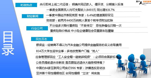每日新闻速递 2019年4月18日 星期四 目录 时政热点 财经新闻 行业公司 民生百态 央行即将上线二代征信: 明确共同还款人、循环贷、分期接入标准 一季度全国居民人均可支配收入8493元 同比增长8.7% 一季度中国经济表现亮丽 专家:6.4%的增速国际罕见 财政部:前两月4400万纳税人享受个税专项附加扣除 不分组多次赔付重疾险“不受待见” 恶性肿瘤也只赔一次 重疾险陷价格战 中小险企健康险会否重蹈车险覆辙 银保监:经销商不得以为汽车金融公司提供金融服务的名义收取费用 834万大学生迎毕业季:多地放宽落户门槛“抢人” 应急管理部回应“工人安全帽一碰就碎视频”:必须符合国家标准 公务员提前退休非新政 是否跟延迟退休大趋势相悖离? 中国约84家互联网公司实行996 专家:涉嫌违反劳动法 亚洲首个同性婚姻地区 台同性婚姻“立法”将实施 时政热点 央行即将上线二代征信: 明确共同还款人、循环贷、分期接入标准 2019-04-17 07:39 来源: 21世纪经济报道 事关近10亿人、2500余万户企业和其他组织,二代征信系统即将全面袭来!截至2018年7月31日,人民银行征信系统已经收录了包括9.7亿自然人信息、企业和其他组织2538万户信息。随着央行二代征信的上线,从进入一、二代融合运行,到二代替换,民众生活、工作中哪些行为将被纳入,无可否认,即将掀起一波关注热潮。二代征信将改变一代企业和个人两个系统、两套机构和用户的管理模式。打通企业和个人系统,实现企业和个人数据的融合。关于一代与二代征信系统的异同点,比如二代如何展示公共信息明细,记录在社会公共部门所形成的正、负面信息,又比如二代征信中,被市场所关注较多的是“共同还款责任”是如何展示相关还款责任信息,等等,记者从个人与企业或者组织角度,做出详尽解读与披露。 财经新闻 一季度全国居民人均可支配收入8493元 同比增长8.7% 2019-04-17 10:07 来源:国家统计局 2019年一季度,全国居民人均可支配收入8493元,比上年同期名义增长8.7%,扣除价格因素,实际增长6.8%。其中,城镇居民人均可支配收入11633元,增长(以下如无特别说明,均为同比名义增长)7.9%,扣除价格因素,实际增长5.9%;农村居民人均可支配收入4600元,增长8.8%,扣除价格因素,实际增长6.9%。一季度,全国居民人均可支配收入中位数7158元,增长8.8%,中位数是平均数的84.3%。其中,城镇居民人均可支配收入中位数10038元,增长8.2%,是平均数的86.3%;农村居民人均可支配收入中位数3663元,增长8.9%,是平均数的79.6%。