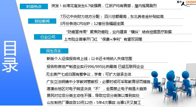 每日新闻速递 2019年4月20日 星期六 目录 时政热点 财经新闻 行业公司 民生百态 突发!台湾花莲发生6.7级强震,江浙沪均有震感,屋内摇晃剧烈 7万亿中央财力地方分配: 四川总额最高,东北养老金补贴较高 3月份各地CPI出炉:12省份涨幅超全国 “防癌宣传周”聚焦防癌险,业内建言“横纵”结合挖掘医疗数据 上市险企首季开门红 “保费+净利”有望双回暖 新版个人征信报告将上线:以卡还卡将纳入失信范围 报告称房地产制造业实行996/995比例最高 已超互联网企业 无主房产七成归国有惹争议,学者:可扩大继承主体 广东立法明确中小学教师管教权:必要时或可采取教育惩罚措施 港澳台地区对电子烟坚决说“不”,全面禁止电子烟是大趋势 居民对垃圾分类主动性不强,导致垃圾分类难以落到实处 山东制药厂事故致10死12伤:5年4次事故 出事1天又复工 时政热点 突发!台湾花莲发生6.7级强震,江浙沪均有震感,屋内摇晃剧烈 2019年04月18日15:34 来源:人民网 据国家地震台网官方微博“中国地震台网速报”消息,中国地震台网正式测定:04月18日13时01分在台湾花莲县海域(北纬24.02度,东经121.65度)发生6.7级地震,震源深度24千米。福建、浙江等地有震感。今年以来,台湾共发生四级以上地震21次,其中4.0到4.9级15次,5.0到5.9级5次,6.0级以上1次,最大地震是本次地震。近一年来,台湾共发生四级以上地震52次,其中4.0到4.9级41次,5.0到5.9级8次,6.0级以上3次,最大地震也是本次地震。 财经新闻 7万亿中央财力地方分配: 四川总额最高,东北养老金补贴较高 2019-04-19 09:09 来源:第一财经 记者梳理公开数据发现,从分配到的总金额来看,四川以约4780亿元居各省份之首;河南以4253亿元紧随其后;湖南、云南、湖北、河北、安徽、黑龙江六地分得中央财政补贴,均超3000亿元但不足4000亿;贵州、新疆、广西、山东、内蒙古、甘肃、陕西、江西、辽宁、吉林十地获得资金在2000亿~3000亿元之间;重庆、山西、西藏、江苏、广东、福建、青海、浙江八地获得补贴在1000亿~2000亿元之间;北京、宁夏、海南、上海、天津五地则都不到千亿元。各地获得中央财政转移支付金额的多少因素比较复杂,财政部针对不同的项目有不同的测算公式。多位财税专家告诉第一财经记者,大致上跟地方经济发展程度、财政实力、人口多少、区域面积、地方努力程度有关。