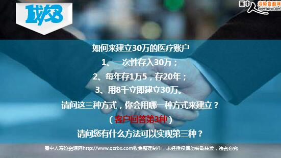 销售健康险必须牢记的四个神奇数字 根据卫生部统计: 人一生当中罹患大病的几率高达 2018年3月14日,北京晚报发文称: 全国政协委员、中国医学科学院阜外医院心律失常诊治中心主任张澍呼吁尽快建立商业医疗保险机制,助力医疗体制改革。张澍表示,当前我国百姓的商业保险理念滞后,商业保险缺乏强制性,且宣传力度不足,商业医保的责任和诚信 无独有偶,两会期间,全国政协委员冯丹龙単士呼吁: 政府需要在商业健康保险对基本医疗保险形成有敁补充方面予以更加明确的指导和鼓励。 商业重疾险应该30万起配置! 所谓5年存活率是指大病治愈后,能够平安活过5年,基本就跟正常人一样的。 在我国5年存活率是60%, 欧美国家高达80-90%, 所以说大病不是绝症。 大病不是绝症,5年存活率是关键! 罹患大病三个人中:有一个人治的好,有一个人治 不好,有一个人因为没钱不得不放弃治疗。 有一位妈妈为他的孩子投保了50万大病险,她是这样说的:“孩子罹患大病,能不能治是老天和医生的事;有没有钱治是我的事。如果治不好,我会很难过,但我能放得下。但如果没有钱不得不放弃治疗,我会很伡心,一辈子都不能原谅自己。很多人说孩子罹患大病是概率问题,但身为他的妈妈,我不敢也不愿意赌。” 你愿意赌吗? 善用密码 1 2 3 4 5 已有社保? 很健康,注重养生,也没有遗传病史…… 没有钱? 大病=绝症…医不了,不用医了 不需要…