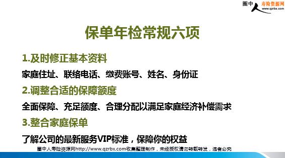 十年风雨固百万永续经营健康险 含金量高 我看健康险 缴费期:以小博大,杠杆比 缴费结束:专款专用 老年期:补充养老 健康险是一切保障的根源 华为无线营销部总裁助理 魏延征 妻子怀孕,他患癌,公司辞退 高职位、财富、家庭,一场大病,一夕破灭 所有客户 拥有200万重疾 全方面保障 我的使命 200万的意义 50万医疗费用 5年恢复期,每月3万 再患重疾的几率极低 提高保额的关键是保单整理 保单年检的好处 n 精准客户需求 n 找到加保方向 保单年检工具-汇总表 一、内容 p 建立一张总表,将所有客户 分别列出 p 对象为购置过保单的客户 p 以家庭为单位建立二、维护时间 p 促成保单后立即更新 保单年检流程(1/3) 一、事前 1.时间:每年年关时固定时间 2.动作: p 逐一微信客户预告递送动作,与客户确认时间,规划派送路径 p 微信发送电子版保单年检报告 p 打印电子保单年检报告 p 准备礼物及《时间走廊》
