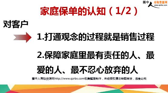 如何看待家庭保单? 家庭保单的认知(1/2) 对客户 1.打通观念的过程就是销售过程 2.保障家庭里最有责任的人、最 爱的人、最不忍心放弃的人 家庭保单的认知(2/2) 对自己 1.拜访一个家庭=三个访量 2.家庭保单助力任务收入事半功倍 3.家庭保障无遗漏,全面体现专业技能 最可怕的是 一个家庭买了保险 出险需要理赔的却不是他 老客户 准客户 准增员 罗列名单 销售逻辑 三画助健康险热销 一画:房屋图 如果有一天, 胳膊太累想休息一下 两堵墙的作用谁能替 代? 请问,两堵墙如果成请问左右两堵墙是谁?为两根钱柱子,源源,不断为家庭积累财富,房子会怎么样? 您觉得哪个账户最重要?请问,一家几口,哪位成员最重要? 都很重要,生活环境一样,患病几率一样,如果没有健康保障,全家人就要抢着去生病!因为在一个没有保障的家庭里,谁先生病谁最得福,因为有全部的家庭资源可以利用,那后来人呢? 科学的规划—四大账户 二画:四大账户如何让责任墙变成生钱墙? 这钱一定是我们的吗? 当我们健健康康时,可以拿钱去 消费、去享受,这个时候钱是我 们的。