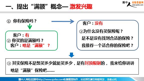 满额销售成就百万百件 健康险“满额销售法”的应用 业绩的突破来自于—— 总公司核保规则中最高免体检重疾保额 什么是“满额”? xx分公司(xx地区)核保规则 注:具体体检内容科技个险均有提示(字母为体检类别) 多少是“满额”? 身为团队长带头销售就行只要客户多少买点就行让客户快速成交就行 我曾经的想法 虽然一直在做组合销售与家庭保单,但保额设计一直在5万-10万之间,所以件均保费徘徊在4000元左右。 一次“意外促成”带来的启发 观念转变—— 情景再现 一次说明会后,组员请我帮忙促成一位“实力派”客户,客户执意只签5万保额 当我了解到客户基本情况后,用“以退为进”法沟通 其实保险可不是谁想买都能买,得是很健康的人才能买。而且不是想买多少买多少,有保额限制的;以你的年龄,今年41岁,最多也就只能保个20万;以你的实力,我看这5份也别买了,没啥意义;万一将来真用上了,5万根本解决不了医疗问题,你还是别买了。反正你是“有钱人”,花钱看病不用心疼。 客户沉思一下,问:“你刚才说我最多只能买多少来着?”…… 沟通要点 现场成交20万保额 促成关键词 最多保…… 只能保…… 解决问题 没啥意义 “满额销售”的意义 让每一次成交价值最大化