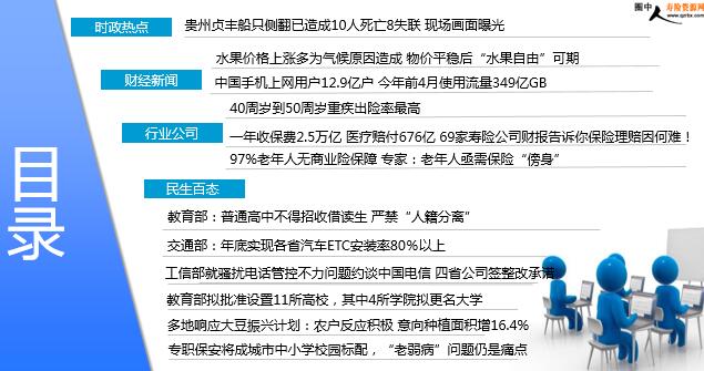 每日新闻速递 2019年5月25日 星期六 目录 时政热点 财经新闻 行业公司 民生百态 贵州贞丰船只侧翻已造成10人死亡8失联 现场画面曝光 水果价格上涨多为气候原因造成 物价平稳后“水果自由”可期 中国手机上网用户12.9亿户 今年前4月使用流量349亿GB 40周岁到50周岁重疾出险率最高 一年收保费2.5万亿 医疗赔付676亿 69家寿险公司财报告诉你保险理赔因何难! 97%老年人无商业险保障 专家:老年人亟需保险“傍身” 教育部:普通高中不得招收借读生 严禁“人籍分离” 交通部:年底实现各省汽车ETC安装率80%以上 工信部就骚扰电话管控不力问题约谈中国电信 四省公司签整改承诺 教育部拟批准设置11所高校,其中4所学院拟更名大学 多地响应大豆振兴计划:农户反应积极 意向种植面积增16.4% 专职保安将成城市中小学校园标配,“老弱病”问题仍是痛点 时政热点 贵州贞丰船只侧翻已造成10人死亡8失联 现场画面曝光 2019-05-24 11:29 来源:北青Qnews 最新消息,据新京报报道,现场救援指挥部消息称,贵州贞丰船只侧翻事故目前已造成10人遇难,8人失联。包括船主已有11人获救,伤员均在医院救治。目前涉事船主已被警方控制。5月24日上午,北京青年报记者从贵州省黔西南布依族苗族自治州州委宣传部了解到,5月23日18时30分左右,黔西南州贞丰县鲁容乡板绕村北盘江流域坝油段一只农户生产生活自用船发生侧翻。事发后,贵州省、州、县应急管理等部门及时赶赴现场开展救援工作。记者连夜赶往事发地看到,现场有大量救援车辆和人员,翻沉的船只位于江边,倒扣于水中,现场救援人员正在试图将船只翻过来。 财经新闻 水果价格上涨多为气候原因造成 物价平稳后“水果自由”可期 2019-05-24 06:39 来源:证券日报 近期,水果涨价成了一个热门话题。不少网友表示“水果真的快吃不起了”,更有网友用近来流行的“财务自由”概念引申出了“水果自由”的说法,一时间引发了舆论的广泛讨论。而记者近日走访发现,北京市海淀区不少超市中丑橘的零售价都在每斤8元以上,随手买上四、五个就要超过20元。海淀某水果店老板徐先生告诉记者,当前水果价格相比去年同期整体上涨了30%左右;就具体品种的涨幅而言,以苹果、丑橘等储存周期较长的水果最为明显。国家统计局的数据显示,4月份CPI同比涨幅为2.5%,创下近半年来的最高水平,其中包括鲜果、猪肉在内的食品项目的涨幅尤为明显。根据农业农村部近日发布的数据,“农产品批发价格200指数”比上周下降1.35%;但重点监测的7种水果平均价格为7.78元每公斤,比上周上涨2.5%。