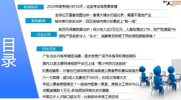 每日新闻速递 2019年5月29日 星期三 目录 时政热点 财经新闻 行业公司 民生百态 2019年高考倒计时10天:这些考试信息要掌握 全球亿万富豪地图出炉:香港大缩水仍超北京,最富不是地产业 城市房价排名出炉:四五线城市房价却要赶上"新一线" 前四月保费数据出炉!合计收入近2万亿元,人身险增近17%,财产险增超7% 保险产品条款令人“头大” 消费者怎样明了买的保险都能保啥? 广东出台29条举措促消费:逐步放宽广深汽车摇号和竞拍指标 国内21家主要网络视频平台已上线“青少年防沉迷系统” 交通运输部:30省份已启动制定取消高速公路省界收费站实施方案 六一大数据:超5成人花费低于500元,80后父母最大方 年轻人要被房租掏空?一线城市租套一居室,房租占工资60%以上 动辄被骗数十万元 多地频发网络交友诈骗案 中国芯片人才缺口超30万:比做软件辛苦工资还低 时政热点 2019年高考倒计时10天:这些考试信息要掌握 2019-05-28 00:02 来源:中国新闻网 5月6日,教育部会同国家教育统一考试工作部际联席会议成员单位联合召开电视电话会议,全面动员和部署做好2019年高考安全工作。教育部部长陈宝生在会上表示,今年高考报名人数超过千万,做好高校考试招生工作使命光荣、责任重大。此前的统计数据显示,全国高考报名人数经历4年稳定后,在2018年涨至975万人,较2017年增加35万人。今年4月,教育部发布的《2019年普通高等学校招生工作规定》明确了今年考试时间: 6月7日9:00至11:30语文;15:00至17:00数学。 6月8日9:00至11:30文科综合/理科综合;15:00至17:00外语。其中,有外语听力测试内容的应安排在外语笔试考试开始前进行。在考题方面,今年4月,教育部下发的《关于做好2019年普通高校招生工作的通知》要求,2019年高考命题要充分体现德智体美劳全面发展要求,以立德树人为鲜明导向,减少单纯死记硬背的知识性考察,推动学生关键能力和核心素养在教学和考试中的落地落实,助力高中育人方式改革。 财经新闻 全球亿万富豪地图出炉:香港大缩水仍超北京,最富不是地产业 2019-05-28 07:41 来源:澎湃新闻 日前,财富咨询机构Wealth-X发布《2019亿万富豪人口普查报告》。报告显示,2018年,全球亿万富豪净资产超过10亿美元的人数,虽然高达2604位,但相比2017年还是下降了5.4%。富豪财富总量方面,除俄罗斯富豪在总财富中上涨11%外,上榜国家或地区中,财富总量均有所下降,中国香港富豪财富缩水17.5%,为上榜名单之最。而在拥有10亿美元以上的富豪总人数方面,印度的下滑最为严重,暴跌21.2%。从国家或地区来看,美国仍是全球亿万富翁最多的国家,共有705位拥有10亿美元以上的富豪,较2017年增加3.7%,但财富总额同比减少4.9%至3.013万亿美元。按美国当前3.3亿人口来算,相当于每46万人中,拥有1个亿万富豪。
