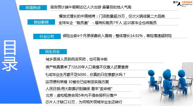 每日新闻速递 2019年5月30日 星期四 目录 时政热点 财经新闻 行业公司 民生百态 报告预计端午假期近亿人次出游 避暑目的地人气高 爆发式增长的中国烧烤:门店数量超29万,仅次火锅成第二大品类 全球车企“裁员潮”:福特拟裁员7千人 这10家车企也将裁员 保险业前4个月原保费收入揭晓:整体增长14.92%,寿险增速超财险 城乡医保人员到药店买药,也可刷卡啦 房产税真要来了?2020年人口普查不仅查人还要查房 七成毕业生月薪不足6000,你真的只在意薪水吗? 这项便利举措 30省份已经制定实施方案 人民日报:用大数据识别骗保 看牢"救命钱" 北京:虚构租房合同5年内不得申报积分落户 芯片人才缺口32万,为何相关领域毕业生还转行 时政热点 报告预计端午假期近亿人次出游 避暑目的地人气高 2019-05-29 12:22 来源:中国新闻网 端午节马上就要来了!携程发布的《2019端午小长假旅游趋势预测报告》显示,今年端午节长假预计将有近1亿人次出游。避暑目的地人气高,亲子景区搜索量激增。数据显示,2018年端午节期间,全国共接待游客8910万人次,同比增长7.9%,实现旅游总收入362亿元。报告预计,国内游热度明显超过去年同期,今年端午节旅游有多重利好因素。景区门票降价优惠、高铁开通、航线增多、免签或落地签目的地增多等有利因素,有力助推国内民众的出游意愿。 财经新闻 爆发式增长的中国烧烤:门店数量超29万,仅次火锅成第二大品类 2019-05-28 21:41 来源:红餐 在大众点评上搜索“烧烤店”,结果显示数量超过16000家。而2015年9月,北京还只有8000多家门店,4年内,数量翻了一倍。美团点评发布的《2018年中式烧烤市场报告》显示,截至2018年6月,以烤串、烤翅、烤肉等烧烤菜品为主要经营业务的中式烧烤,在全国有29万家门店,是仅次于火锅的第二大品类。低门槛,架个摊就能做的烧烤,人人都觉得自己可以分一杯羹。结果就是29万大军过独木桥,大家都朝着品牌化和品质化的方向发展,但是还没有拼出一个全国性势能强劲的品牌。而在烧烤大洗牌时期,除了横向上的数量增长,我们发现,纵向上烧烤市场目前也在经历着一些变化。