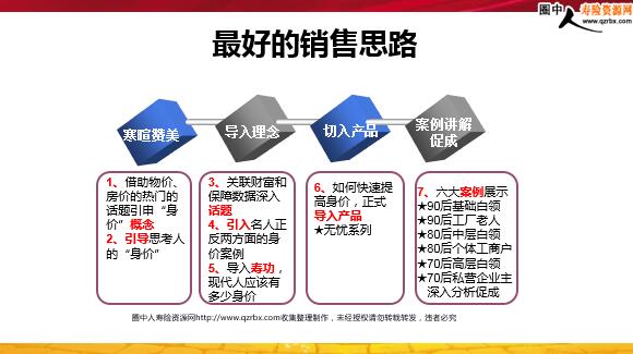 身价法 健康险快速成交法 守望属于我们自己的那片海 最好的销售思路:顺利走完销售流程 最好的销售方法:加保,保额销售 最好的销售思路 寒暄赞美 导入理念 切入产品 案例讲解 促成 1、借助物价、房价的热门的话题引申“身价”概念 2、引导思考人的“身价” 3、关联财富和保障数据深入话题 4、引入名人正反两方面的身价案例 5、导入寿功,现代人应该有多少身价 6、如何快速提高身价,正式导入产品 ★无忧系列 7、六大案例展示 ★90后基础白领 ★90后工厂老人 ★80后中层白领 ★80后个体工商户 ★70后高层白领 ★70后私营企业主 深入分析促成 过年前后,菜价很高,包括鸡蛋和猪肉的身价也是越来越高,和客户通过菜价聊天,会很容易产生共鸣! 大城市的房价更是炙手可热的新闻元素,尤其是北京上海深圳一线城市 房子的身价越来越高,很多有房的客户也是身价看涨 鸡蛋、猪肉、房子都有身价,都越来越高,人的“身价”如何确定,如何越来越高呢? 现在国人越来越有钱,2018年全球约一半的奢侈品都被国人买走,但国人的保障确认仍然比发达国家落后很多,亟待提升“身价” 名人都是用买高额保单来提高身价 我们需要提升哪些“身价”这些身价又需要拥有
