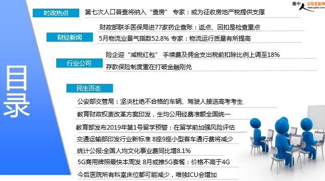 每日新闻速递 2019年6月5日 星期三 目录 时政热点 财经新闻 行业公司 民生百态 第七次人口普查将纳入“查房” 专家:或为征收房地产税提供支撑 财政部联手医保局进77家药企查账:返点、回扣是检查重点 5月物流业景气指数52.8% 专家:物流运行质量有所提高 险企迎“减税红包” 手续费及佣金支出税前扣除比例上调至18% 存款保险制度重在打破金融刚兑 公安部交管局:坚决杜绝不合格的车辆、驾驶人接送高考考生 教育财政权责改革方案印发,生均公用经费准额全国统一 教育部发布2019年第1号留学预警:在留学前加强风险评估 交通运输部印发行业新标准 8座9座小型客车通行费将减少 统计公报:全国人均文化事业费同比增8.1% 5G商用牌照最快本周发 8月或推5G套餐:价格不高于4G 今后医院所有科室床位都可能减少,唯独ICU会增加 时政热点 第七次人口普查将纳入“查房” 专家:或为征收房地产税提供支撑 2019-06-04 06:09 来源:证券日报 2020年,我国将迎来第七次全国人口普查,将彻查人口出生变动情况以及房屋情况。专家认为,这将对房地产税征缴提供必要的数据支撑。“本次人口普查不同于以往,除了人口外还要进行房屋普查,这意味着普查结果很可能将会给房地产税的推行提供参考。”苏宁金融研究院高级研究员付一夫对《证券日报》记者表示,人口普查是一项重要的国情调查,其目的在于找准人口规模和结构,摸清流动人口趋势和分布,是国家制定重大方针政策与编制国民经济和社会发展战略规划的重要依据。记者获悉,6月1日,上海市第七次全国人口普查嘉定专项试点工作正式启动,入户调查主要内容包括住房情况等。 财经新闻 财政部联手医保局进77家药企查账:返点、回扣是检查重点 2019-06-04 06:25 来源:每日经济新闻 据财政部网站信息显示,财政部决定组织部分监管局和各省、自治区、直辖市财政厅(局)于2019年6月至7月开展医药行业会计信息质量检查工作。值得注意的是,国家医疗保障局参与了此次检查工作。记者从知情人士处获悉的《财政部关于开展2019年度医药行业会计信息质量检查工作的通知》显示,此次检查的内容包括药企遵守会计法律法规、财务会计制度、内部控制规范等情况,还包括药企费用、成本、收入的真实性。按照“双随机、一公开”的要求,2019年5月14日,财政部监督评价局会同国家医疗保障局基金监管司,共同随机抽取了77户医药企业检查名单。从公布的77户医药企业检查名单来看,包括了上海复星医药(集团)股份有限公司、江苏恒瑞医药股份有限公司等多家A股上市公司。值得注意的是,近期陷入风波的山东步长制药股份有限公司也在检查名单中。