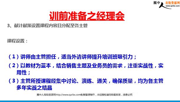 如何让职场衔接培训落地?(内勤版) 新晋主管的困惑 激励不起来培训不出勤心有旁骛干扰太多人员脱落 …… 问:衔接培训 主角是谁? 训前准备 启动:一、支公司经策会宣导: 二、层层启动: 一级经理—职场主管—伙伴 训前准备之经理会 将帅同心,达成共识 集团队力量,为你的新人效力 训前准备之经理会 2、制定衔接培训期间的纪律要求并一致通过: 主管除婚丧、病卧在医院外,不得请假,否则无条件认罚 遵守培训纪律 (1)培训期间不得请假,组经理(不含)以下代理职级的保险营销员每缺席一次降低当月代理手续费(佣金)20元;组经理(含)以上代理职级的保险营销员每缺席一次降低当月代理手续费(佣金)40元。(2)培训期间不得迟到、早退、严禁无故缺席。(3)课堂中禁止吸烟、喝水、吃任何食品;(4)上课请将手机关闭或置于震动状态,不得接听电话;(5)上课期间不得走动,保持教室肃静,禁止大声喧哗;违反上述(2)—(5)项规定者,所属团队扣2分; 训前准备之经理会 3、献计献策设置课程内容且分配至各主管 课程设置: (1)讲师由主管担任,适当外请讲师提升培训班吸引力;