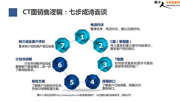 CT图安装 CT图销售逻辑:七步成诗面谈 第一步:什么是专业化电话约访?为什么要做? 目标明确且唯一 接触准客户的唯一目标是取得“有效面谈”的机会。 7个基本步骤 自我介绍:介绍自己姓名和单位说明来意:向准客户说明来电的目的 建立信任:透过第三者或转介绍人的影响力 客户决定:向(准)客户保证由他决定保障需求分析概念是否有价值 所需时间:拜访面谈需要20分钟时间及“二选一”的方法预约见面时间处理异议:细心聆听并处理每次异议 ,至少处理2次以上再次确定会面时间:如成功约见,必须确认约见日期、时间、地点。 第一步:电约准备与心态 1、准备“准客户”名单及相关资料计划100、电话约访名单日程手册准备 2、专注于“唯一”目标——邀约有效面谈简单、直接掌握对话技巧以达到目标 3、至少尝试2次要求面谈(也可以至少3次)每次面谈的机会都是需要经过努力获得的 4、保存记录方便记录电话约访达成率记录对话内容以便跟进 第一步:电约关键句演练(新人缘故客户) 业务员:你好,是老陈吗,我是XX,方便讲两句吗?客 户:哦,XXX啊。 业务员:老陈,最近我加入了XXX,学习到了一个“如何用1000元钱解决35万应急金重要的家庭保障概念”,想跟你分享一下,只要15分钟到20分钟时间,你看明天、和周一下午你哪个时间方便?客 户:呃…XX,我已经买过保险了。业务员:老陈原来你很有保险意识,不要太有压力,买不买、跟谁买,一切都由你决定。我只需要15分钟到20分钟的时间,你也给我提提建议!你看你是明天和周一下午哪个时间方便?客 户:那好吧,周一下午吧。业务员:谢谢老陈你给我机会,周一下午12:00我在你公司旁边的茶餐厅等你。
