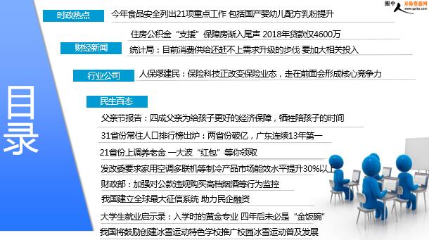 每日新闻速递 2019年6月17日 星期一 目录 时政热点 财经新闻 行业公司 民生百态 今年食品安全列出21项重点工作 包括国产婴幼儿配方乳粉提升 住房公积金“支援”保障房渐入尾声 2018年贷款仅4600万 统计局:目前消费供给还赶不上需求升级的步伐 要加大相关投入 人保缪建民:保险科技正改变保险业态,走在前面会形成核心竞争力 父亲节报告:四成父亲为给孩子更好的经济保障,牺牲陪孩子的时间 31省份常住人口排行榜出炉:两省份破亿,广东连续13年第一 21省份上调养老金 一大波“红包”等你领取 发改委要求家用空调多联机等制冷产品市场能效水平提升30%以上 财政部:加强对公款违规购买高档烟酒等行为监控 我国建立全球最大征信系统 助力民企融资 大学生就业启示录:入学时的黄金专业 四年后未必是“金饭碗” 我国将鼓励创建冰雪运动特色学校推广校园冰雪运动普及发展 时政热点 今年食品安全列出21项重点工作 包括国产婴幼儿配方乳粉提升 2019-06-16 10:03:52 来源:中国新闻网 记者15日从中国国家市场监督管理总局获悉,国务院食品安全委员会近日印发了《2019年食品安全重点工作安排》。根据《安排》,2019年中国食品安全重点工作包括实施风险评估和标准制定专项行动、国产婴幼儿配方乳粉提升行动、校园食品安全守护行动等21项。《安排》将21项重点工作细化部署到了各部门。值得注意的是,在实施国产婴幼儿配方乳粉提升行动中,《安排》明确启动新一轮婴幼儿配方乳粉生产企业质量控制体系“三年全覆盖”检查。督促企业监测上市产品质量安全状况,主动报告风险,婴幼儿配方乳粉和辅助食品生产企业自查率达到100%。 财经新闻 住房公积金“支援”保障房渐入尾声 2018年贷款仅4600万 2019-06-15 08:16 来源:中国经营报 自2009年开始的住房公积金贷款支援保障性住房建设的试点工作,在启动10年之后,已经渐入“尾声”。这项出台时存在一定争议,却又对保障性住房建设和棚改发挥了重要支持作用的政策,将要面临一个新的周期。“部里面和我们通报的情况,2018年以住房公积金发放的保障房建设贷款,大概是0.46亿元的样子,这是全国范围的统计口径,我们觉得这个数据已经比较低了,实际上一年才发了4600万元贷款。”日前,东部某省住建厅的内部人士告诉记者。住房公积金用于发放保障性住房项目贷款试点,是2009年开始的一项制度安排。当年,财政部、中国人民银行总行、住建部联合下发160号文件,启动住房公积金发放保障性住房建设贷款的试点工作。