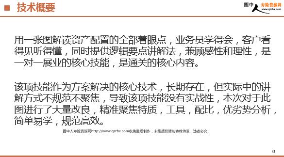 年金险销售基本技术 产品定位 BACKGROUND 定位 我们推荐的不是商品,是一种待了解的有用的钱的变形方案; 把有用的方案计划推荐给想用的人; 客户最终决定选择,一定主要是因为1-2个重要理由; 客户不是学生,我们不企图教育,而是引导和建议; 定位:产品、客户、技术 产品、客户定位 产品、客户定位 标准普尔图 ADVANTAGE 技术概要 用一张图解读资产配置的全部着眼点,业务员学得会,客户看得见听得懂,同时提供逻辑要点讲解法,兼顾感性和理性,是一对一展业的核心技能,是通关的核心内容。 该项技能作为方案解决的核心技术,长期存在,但实际中的讲解方式不规范不聚焦,导致该项技能没有实战性,本次对于此图进行了大量改良,精准聚焦特质,工具,配比,优劣势分析,简单易学,规范高效。