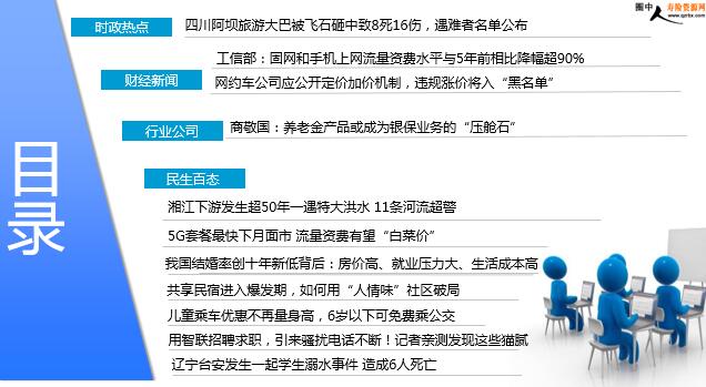 每日新闻速递 2019年7月13日 星期六 目录 时政热点 财经新闻 行业公司 民生百态 四川阿坝旅游大巴被飞石砸中致8死16伤,遇难者名单公布 工信部:固网和手机上网流量资费水平与5年前相比降幅超90% 网约车公司应公开定价加价机制,违规涨价将入“黑名单” 商敬国:养老金产品或成为银保业务的“压舱石” 湘江下游发生超50年一遇特大洪水 11条河流超警 5G套餐最快下月面市 流量资费有望“白菜价” 我国结婚率创十年新低背后:房价高、就业压力大、生活成本高 共享民宿进入爆发期,如何用“人情味”社区破局 儿童乘车优惠不再量身高,6岁以下可免费乘公交 用智联招聘求职,引来骚扰电话不断!记者亲测发现这些猫腻 辽宁台安发生一起学生溺水事件 造成6人死亡 时政热点 四川阿坝旅游大巴被飞石砸中致8死16伤,遇难者名单公布 2019-07-12 09:45 来源:中国新闻网 针对“一辆大巴被飞石砸中”一事,今日,阿坝州委外宣办官方微博发布通报称,事故已造成8死16伤,并公布了遇难者身份。通报称,松潘县“7.11”飞石砸中客车意外事故,已在巨石下找到4名失联乘客,4人均无生命体征,确认死亡,另1名受伤人员因伤势过重抢救无效死亡。通报指出,目前,事故已造成8人死亡,15人在松潘县人民医院接受治疗,1人转院成都,出院1人,平安5人。据悉,该客车核载人数37人,实载30人(包括驾驶员)。 财经新闻 工信部:固网和手机上网流量资费水平与5年前相比降幅超90% 2019-07-12 11:25 来源:人民日报 信息消费时代,对通信基础设施提出更高要求,也对提速降费有了更大需求。国办印发《关于加快高速宽带网络建设推进网络提速降费的指导意见》4年来,从套餐规范到网络扩容,从取消漫游费到千兆宽带入户,网络提速降费步伐加快,为人们的生产和生活带来更多便利,也为经济社会发展注入崭新活力。近年来,电信运营商陆续推出多款提速降费“大礼包”,网络覆盖越来越广、网速越来越快、资费越来越低、流量套餐包越来越实惠,降费实实在在,消费明明白白。今年《政府工作报告》提出,2019年中小企业宽带平均资费再降低15%,移动网络流量平均资费再降低20%以上。