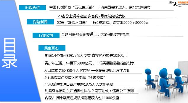每日新闻速递 2019年7月15日 星期一 目录 时政热点 财经新闻 行业公司 民生百态 中国16城跻身“万亿俱乐部” :济南西安未进入、东北集体缺席 23省份上调养老金 多省份7月底前完成发放 家长“暑假不自由”:超6成家庭月均支出5000至30000元 互联网保险长跑赛道上,大象保险的守与进 湖南14个市州393万余人受灾 直接经济损失103亿元 青少年近视一年吞下6800亿元,一场需要群防群控的战争 人口结构老龄化催生万亿市场 一类股长线机会逐步浮现 5个地震重点预警区将实现“秒级预警” 北京轨道交通日客运量超1375万人次创新高 对乘客车厢吃东西选择性执法?南京地铁:违反公平原则 内蒙古拆除草原违规私搭乱建蒙古包11000余座 时政热点 中国16城跻身“万亿俱乐部” :济南西安未进入、东北集体缺席 2019-07-14 09:45 来源:中国新闻 “万亿俱乐部”正在不断扩容。宁波和郑州2018年度GDP首次突破万亿元,至此,中国跻身“万亿俱乐部”的城市已有16个,包括上海、北京、广州、深圳、天津、苏州、重庆、武汉、成都、杭州、南京、青岛、无锡、长沙、宁波、郑州。名单之外的城市也纷纷表明决心。“我们的目标是,通过产业发展拉动,用两到三年时间,让福州的GDP突破万亿,跻身‘万亿俱乐部’,城市综合实力再上一个新台阶。”近日,福州市委书记王宁对媒体表示。不仅是福州,GDP超过8000亿的佛山、济南、西安、东莞、合肥、南通等城市,也在候选名单上,这些城市都将进入“万亿俱乐部”作为近期发展目标。 财经新闻 23省份上调养老金 多省份7月底前完成发放 2019-07-14 09:00 来源:中新经纬 我国目前的基本养老保险制度,按照覆盖人口类型划分,可以分为企业职工、机关事业单位人员和城乡居民三大类。据不完全统计,今年已有23省份上调养老金。其中,单独上调城乡居民基础养老金定额的共有河南、青海、天津、西藏4个省份,单独企业职工退休养老金定额上调的共有辽宁、新疆、陕西等14个省份。另外,北京、上海、广东、江苏、福建5个省份同时上调了城乡居民基础养老金与企业职工退休养老金定额。