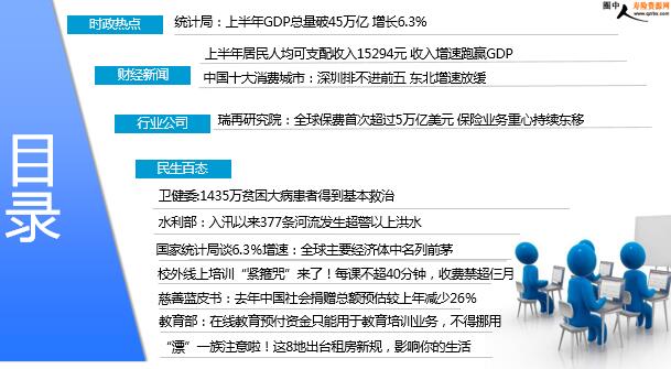 每日新闻速递 2019年7月16日 星期二 目录 时政热点 财经新闻 行业公司 民生百态 统计局:上半年GDP总量破45万亿 增长6.3% 上半年居民人均可支配收入15294元 收入增速跑赢GDP 中国十大消费城市:深圳排不进前五 东北增速放缓 瑞再研究院:全球保费首次超过5万亿美元 保险业务重心持续东移 卫健委:1435万贫困大病患者得到基本救治 水利部:入汛以来377条河流发生超警以上洪水 国家统计局谈6.3%增速:全球主要经济体中名列前茅 校外线上培训“紧箍咒”来了!每课不超40分钟,收费禁超仨月 慈善蓝皮书:去年中国社会捐赠总额预估较上年减少26% 教育部:在线教育预付资金只能用于教育培训业务,不得挪用 “漂”一族注意啦!这8地出台租房新规,影响你的生活 时政热点 统计局:上半年GDP总量破45万亿 增长6.3% 2019-07-15 10:03 来源:中国新闻网 国家统计局15日发布的数据显示,初步核算,上半年国内生产总值450933亿元,按可比价格计算,同比增长6.3%。分季度看,一季度同比增长6.4%,二季度增长6.2%。 财经新闻 上半年居民人均可支配收入15294元 收入增速跑赢GDP 2019-07-15 10:21 来源:中国新闻网 国家统计局15日发布的数据显示,上半年居民收入增长快于经济增速。上半年,全国居民人均可支配收入15294元,同比名义增长8.8%,增速比一季度高0.1个百分点;扣除价格因素实际增长6.5%,比经济增速高0.2个百分点。全国居民人均可支配收入中位数13281元,同比名义增长9.0%。