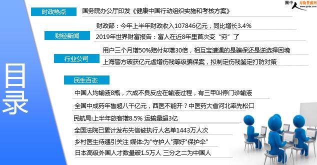 每日新闻速递 2019年7月17日 星期三 目录 时政热点 财经新闻 行业公司 民生百态 国务院办公厅印发《健康中国行动组织实施和考核方案》 财政部:今年上半年财政收入107846亿元,同比增长3.4% 2019年世界财富报告:富人在近8年里首次变“穷”了 用户三个月增50%赔付却增30倍,相互宝遭遇的是骗保还是逆选择困境 上海警方破获亿元虚增伤残等级骗保案,拟制定伤残鉴定打防对策 中国人均输液8瓶,六成不良反应在输液过程,有三甲叫停门诊输液 全国中成药年售超八千亿元,西医不能开?中医药大省河北率先松口 民航局:上半年旅客增8.5% 运输量超3亿 全国法院已累计发布失信被执行人名单1443万人次 乡村医生待遇引关注 媒体:为"守护人"撑好"保护伞" 日本高级外国人才数量破1.5万人 三分之二为中国人 时政热点 国务院办公厅印发《健康中国行动组织实施和考核方案》 2019-07-15 16:03 来源:新华网 近日,国务院办公厅印发《健康中国行动组织实施和考核方案》。《方案》提出,建立健全组织架构,依托全国爱国卫生运动委员会,成立健康中国行动推进委员会,制定印发《健康中国行动(2019-2030年)》,统筹推进组织实施、监测和考核相关工作。推进委员会主任由国务院分管领导同志担任,推进委员会办公室设在国家卫生健康委。推进委员会下设各专项行动工作组,设立专家咨询委员会。《方案》要求,各有关部门要积极研究实施健康中国战略的重大问题,及时制定并落实《健康中国行动(2019-2030年)》的具体政策措施,提出年度任务建议并按照部署抓好工作落实,做好《健康中国行动(2019-2030年)》的宣传解读。 财经新闻 财政部:今年上半年财政收入107846亿元,同比增长3.4% 2019-07-16 10:03 来源:经济日报 7月16日,财政部召开2019年上半年财政收支情况新闻发布会。统计显示,1-6月累计,全国一般公共预算收入107846亿元,同比增长3.4%。其中,中央一般公共预算收入51589亿元,同比增长3.4%;地方一般公共预算本级收入56257亿元,同比增长3.3%。全国税收收入92424亿元,同比增长0.9%;非税收入15422亿元,同比增长21.4%。1-6月累计,主要收入项目情况如下:国内增值税35570亿元,同比增长5.9%;国内消费税8471亿元,同比增长23.3%;企业所得税25199亿元,同比增长5.3%;个人所得税5639亿元,同比下降30.6%;进口货物增值税、消费税8291亿元,同比下降2.7%;关税1405亿元,同比下降3.4%。