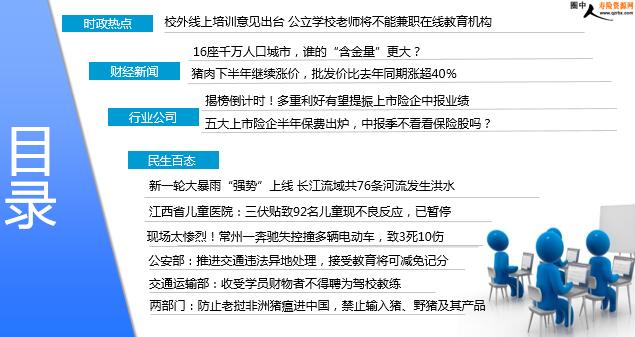 每日新闻速递 2019年7月18日 星期四 目录 时政热点 财经新闻 行业公司 民生百态 校外线上培训意见出台 公立学校老师将不能兼职在线教育机构 16座千万人口城市,谁的“含金量”更大? 猪肉下半年继续涨价,批发价比去年同期涨超40% 揭榜倒计时!多重利好有望提振上市险企中报业绩 五大上市险企半年保费出炉,中报季不看看保险股吗? 新一轮大暴雨“强势”上线 长江流域共76条河流发生洪水 江西省儿童医院:三伏贴致92名儿童现不良反应,已暂停 现场太惨烈!常州一奔驰失控撞多辆电动车,致3死10伤 公安部:推进交通违法异地处理,接受教育将可减免记分 交通运输部:收受学员财物者不得聘为驾校教练 两部门:防止老挝非洲猪瘟进中国,禁止输入猪、野猪及其产品 时政热点 校外线上培训意见出台 公立学校老师将不能兼职在线教育机构 2019-07-17 09:13 来源:中国之声 有数据显示,2018年中国在线教育市场规模超2300亿元,同比增长21.07%,从学前教育到高中毕业,在线教育全覆盖,受到越来越多家长的欢迎。不过,线上教育也有不少“成长中的烦恼”,规范校外线上培训,也成为巩固校外培训治理成果的必然要求。在《国务院办公厅关于规范校外培训机构发展的意见》印发近一年后,本月15号,教育部等六部门发布了《关于规范校外线上培训的实施意见》,对校外线上教育的培训时长、资质、内容都做出了规定。培训机构需要备案、培训时长不得超过40分钟、小学1-2年级的不得留作业、按课时收费的,每科不得一次性收取超过60课时的费用…… 财经新闻 16座千万人口城市,谁的“含金量”更大? 2019-07-17 11:18 来源:人民日报 当下,人口日益成为影响经济增长的关键要素,城市间的“人口竞争”也愈演愈烈。对于中国任何一个有“野心”的城市而言,“千万人口”都是一个亟待突破的目标。近日,“杭州人口突破1000万”的消息不胫而走,不过很快就被当地媒体以“非官方发布”为由否定。这一数字来源,是杭州市统计局发布的5月月报。其中显示,杭州基本医疗保险参保人数已突破1000万人,达到1006万人。医保参保人数与常住人口虽然不能完全划等号,但在全国医保参与率达95%以上背景下,两者显然有明显相关性。