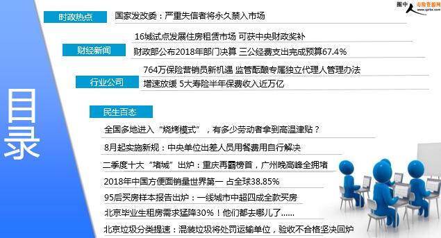 每日新闻速递 2019年7月20日 星期六 目录 时政热点 财经新闻 行业公司 民生百态 国家发改委:严重失信者将永久禁入市场 16城试点发展住房租赁市场 可获中央财政奖补 财政部公布2018年部门决算 三公经费支出完成预算67.4% 764万保险营销员新机遇 监管酝酿专属独立代理人管理办法 增速放缓 5大寿险半年保费收入近万亿 全国多地进入“烧烤模式”,有多少劳动者拿到高温津贴? 8月起实施新规:中央单位出差人员用餐费用自行解决 二季度十大“堵城”出炉:重庆再霸榜首,广州晚高峰全拥堵 2018年中国方便面销量世界第一 占全球38.85% 95后买房样本报告出炉:一线城市中超四成全款买房 北京毕业生租房需求猛降30%!他们都去哪儿了…… 北京垃圾分类提速:混装垃圾将处罚运输单位,验收不合格坚决回炉 时政热点 国家发改委:严重失信者将永久禁入市场 2019-07-19 08:23 来源:人民网 日前,国务院办公厅印发《关于加快推进社会信用体系建设 构建以信用为基础的新型监管机制的指导意见》(以下简称《意见》),对我国信用体系建设做出新的顶层规划。18日,在国新办举行的加快推进社会信用体系建设吹风会上,国家发展改革委等部门对此进行了详解。公共信用综合评价制度,是此次《意见》中明确的一项重要制度。国家发展改革委副主任连维良在吹风会上表示,公共信用综合评价制度正在建立和完善当中。要同时充分发挥行业信用评价、市场化第三方评价、行业协会商会评价等作用。这主要是基于来自政府各部门的公共信用信息,以此为基础对企业信用状况作出评价。 财经新闻 16城试点发展住房租赁市场 可获中央财政奖补 2019-07-19 11:18 来源:光明网 近日财政部、住房和城乡建设部组织开展了中央财政支持住房租赁市场发展试点竞争性评审工作。按照竞争性评审得分,北京、长春、上海、南京、杭州、合肥、福州、厦门、济南、郑州、武汉、长沙、广州、深圳、重庆、成都等16个城市入围中央财政支持住房租赁市场发展试点。有业内人士表示,此次试点意在利用三年时间,支持部分人口净流入、租赁需求缺口大的大中城市发展住房租赁市场,构建有利的体制机制,多渠道筹集租赁住房房源,促进专业化、机构化租赁企业发展,建设住房租赁信息服务与监督平台,改善租赁住房消费环境,加快形成租购并举的格局。