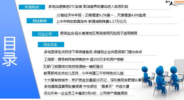 每日新闻速递 2019年7月24日 星期三 目录 时政热点 财经新闻 行业公司 民生百态 多地加速推进ETC安装 取消省界收费站进入实质阶段 22省经济半年报:云南增速9.2%第一,天津增速4.6%垫底 上半年税收数据发布 新增减税降费1.17万亿元 银保监会:延长香港地区再保信用风险因子适用期限 多地医保定点药店下架保健食品 保健品企业向医保部门提出申诉 工信部:携号转网有序推进中 超200万手机用户尝鲜 五部门:我国将对自然资源统一确权登记 教育部将试点幼儿足球,今年将建三千所特色幼儿园 十大最有钱城市:京沪资金总量超10万亿,深圳贵阳合肥增长最快 多地遭高温暴雨轮番侵袭 中东部在 “桑拿天”中迎大暑 河北怀来一企业员工中毒致5死4伤,公司停产调查原因 时政热点 多地加速推进ETC安装 取消省界收费站进入实质阶段 2019-07-23 11:52 来源:央视网新闻 新疆首件不停车电子收费系统(ETC)门架系统工程在G30线吐鲁番大河沿吊装完成,标志着新疆取消高速公路省界收费站工程全面启动。近期,浙江、安徽、湖北、甘肃、河南等省份都已印发取消高速公路省界收费站实施方案,加速推进ETC安装,相关工作进入实质性建设阶段。今年的政府工作报告提出,两年内基本取消全国高速公路省界收费站,实现不停车快捷收费,减少拥堵、便利群众。5月5日召开的国务院常务会议,明确政策举措力争今年底前基本取消全国高速公路省界收费站,便利群众出行提高物流效率。 财经新闻 22省经济半年报:云南增速9.2%第一,天津增速4.6%垫底 2019-07-23 12:21 来源:澎湃新闻 截至7月22日,全国已有广东、浙江、河南、四川、湖北、湖南、福建等22省份公布上半年经济数据。从上半年经济总量上看,广东GDP首次突破5万亿元,达到5.05万亿元,同比增长6.5%,位于年度目标区间上限。江苏、山东暂未公布相关数据,浙江上半年以2.83万亿元暂列全国第二。四川今年上半年首次突破2万亿元,GDP为2.05万亿元。从上半年经济增速上看,已经公布上半年成绩单的22省份中,14省份超越或持平于全国平均线(6.3%)。云南、贵州经济继续保持高增长。其中,云南上半年增速为9.2%,增速排名较去年同期超越贵州暂列第一。