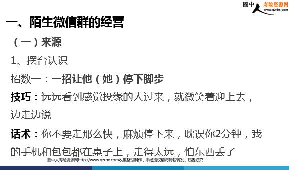微信营销法 PART 1 我对保险的认识 错误的认知 我的微信营销法 PART 2 一、陌生微信群的经营 二、老乡群的经营 三、老客户群的经营 一、陌生微信群的经营 (一)来源 1、摆台认识 2、随缘认识 一、陌生微信群的经营 (一)来源 1、摆台认识 招数一:一招让他(她)停下脚步 技巧:远远看到感觉投缘的人过来,就微笑着迎上去, 边走边说 话术:你不要走那么快,麻烦停下来,耽误你2分钟,我 的手机和包包都在桌子上,走得太远,怕东西丢了 一、陌生微信群的经营 (一)来源 1、摆台认识 招数二: 成功让他坐下来 话术:要不我们到桌子边坐下来聊吧,你应该走累了,不 赶时间的话,不如坐下来聊几句 成果:通过摆台,几年来增员近50人,没有来参加培训 的一些陆续变成了客户 (一)来源 2、随缘认识: 招数一: 一招让他(她)停下脚步 技巧:看到面善主动搭讪,寒暄赞美(小妹,不用上班吗?这么悠闲,好羡 慕你哦) 话术:我是保险公司的,以后有保险方面的需求,可以咨询我,我猜你应该 有在保险公司上班的亲戚朋友,没关系,虽然我是陌生人,但是我很实在诚 恳,尽职尽责,每家公司的产品都了解,你都可以咨询我。也许你认为我们 公司不大,但是我选择这里肯定有我的原因,因为产品有很大优势。