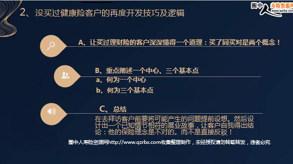 健康险销售攻略 目录页 CONTENTS 一、案例说明各种客户类型销售策略及逻辑 二、结合个人成长经历阐述年薪十万、百万、千万的目标客户及经营 四、如何进行健康险设计及说明 三、如何运用体检和契调牢牢黏住客户 案例说明各种客户类型销售策略及逻辑 1、老客户的再度开发技巧及销售逻辑 E、新客户销售技巧及经营 2、没买过健康险客户的再度开发技巧及逻辑 A、让买过理财险的客户深深懂得一个道理:买了同买对是两个概念! B、重点阐述一个中心、三个基本点 C、总结 a、何为一个中心 b、何为三个基本点 在去拜访客户前要将可能产生的问题提前设想。然后设计出一个已知情节相符的展业故事,让客户自我得出结论:他的保险理念是不对的。而不是直接反驳! 3、有钱人对保险不感兴趣的开发技巧及逻辑 结合个人成长经历阐述年薪十万、百万、千万的目标客户及经营 1、年薪十万的目标客户群体及开发逻辑 卧牛村案例 村民靠山吃山,均做大理石石材生意 大王村案例 村民均从事运输行业 A、农村包围城市 C、攻坚克难、各个击破 B、寻找关键突破口 2、年薪百万时的目标客户群体及开发逻辑 2、年薪百万时的目标客户群体及开发逻辑 C、客户类型举例 小企业主