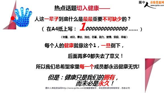 五指销售逻辑 健康险 五指联想记想忘都很难 热点话题切入健康—— 人这一辈子到底什么是最最重要不可缺少的? ( 在A4纸上写: 100000000000000 …… ) (财富、成功、事业、地位、名誉、能力、爱情、家庭、幸福) 每个人的健康就像这个1,一旦倒下, 后面再多0都失去了意义! 所以我们总希望家里每一个成员都永远健康无忧! 但是:健康只是我们的拥有, 而未必是永久! 转入“亚健康”—— 世界卫生组织公布:70%的人处于亚健康状态, 随时面临疾病的威胁,生病是迟早的事! 而每个家庭的任何一个成员, 一旦生病,尤其是重大疾病,就会牵连整个家庭,甚至整个家族。(交流热点话题、典型案例及健康名言,引起共鸣) 身体的三座大山 日益恶化的环境污染饮食安全问题工作压力 奢侈品一:空气 奢侈品二:水 奢侈品三:食物 引入三种方法—— 为应对重大疾病对幸福家庭的伤害,假设需要50万, 1、一次性放50万解决后顾之忧 2、20年不间断定期存款2.5万 3、与时俱进搞“按揭”,把全家每个人的健康风险都转嫁给保险公司, 从首付第一笔保费90天后立即全权拥有50万现金, 有病看病,无病传富 据CCTV经济生活大调查结果显示,2018年十大需求排行榜中,为自己和 家人选择保险连续3年排名第1位。 举实例说明—— 为我有一个客户XXX,他说他同学才34岁,上周单位体检突然查出肝癌,平时烟酒都不沾,太意外了!